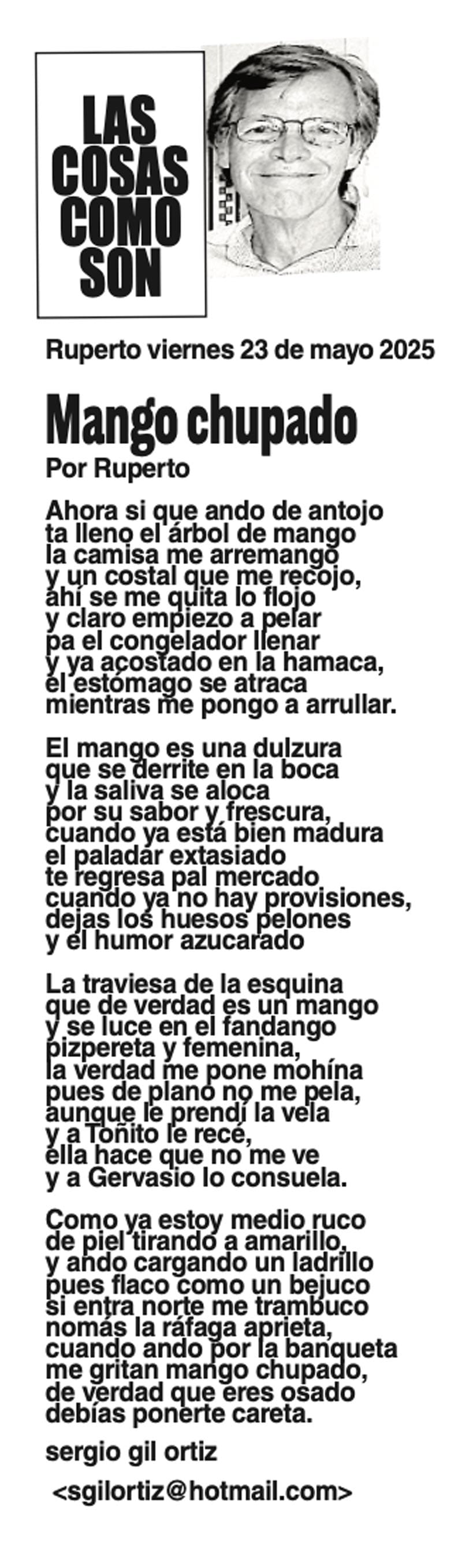 LAS COLUMNAS LAS COSAS COMO SON - MANGO CHUPADO MANGO CHUPADO... 23 mayo 2025 Más Noticias CANCIONERO | PIRATAS DEL CARIBE - A la pregunta de qué va a hacer con el petróleo que llevaba el barco tanque grandote llamado Skipper y con bandera falsa de Guyana, que sus fuerzas armadas... ACERTIJOS | LOS 51 AÑOS DE NOTIVER - Allá por los años 70s nacía Notiver. Un día Guadalupano por un asunto de festejo familiar. Desde aquel día de hace 51 años, que este 12 de diciembre se cumplen, el diario... TEXTO IRREVERENTE | - Monumental, mágico, misterioso y meritorio. Así definen arqueólogos y antropólogos a El Tajín, la ciudad prehispánica que se ubica cerca de Papantla, al norte veracruzano... A MIL POR HORA | - **Los duendes existen **Honrar al IMSS **Comadrita traviesa **Javier Duarte seguirá preso... TEXTO IRREVERENTE | CINCUENTA + UNO - La familia notiveriana está velando vísperas pues mañana es su fiesta magna, la que tiene lugar cada fin de otoño, ya pisando el invierno. El cumpleaños de NOTIVER comparte fecha... CANCIONERO | EL GOZO AL POZO...DE AGUA - Muy pronto se apagó el argüende mediático armado desde Palacio Nacional, en torno a la señora presidente con A de patria, celebrando con sonrisa pareja del primer ministro de Canadá, el bailoteo al ritmo de YMCA... SIN TACTO | 4T, LAS CUENTAS ALEGRES - Bueno, cuando menos podemos aceptar que los morenos en el poder tienen una capacidad: seguir al pie de la letra las instrucciones del librito que indica cómo responder y qué decir… ACERTIJOS | POR LOS 51 DE NOTIVER - Un día antes auguraban un gran Norte, que entró en lunes. Al iniciar semana. Cotidianamente llegó con mi hermano Enrique, con Fernando Pavón, biógrafo de Tierra Blanca y el amigo... 51 Y CONTANDO… | - Medio siglo y un año, no se escribe ni fácil ni sin derramar una que otra lagrimilla: 51 años de éste su periódico NOTIVER. La Noticia en el momento que sucede, es un acontecimiento más... A MIL POR HORA | - **Migrante exitoso **Genio universal **Manipulador de mujeres **Ley vs vapeadores...