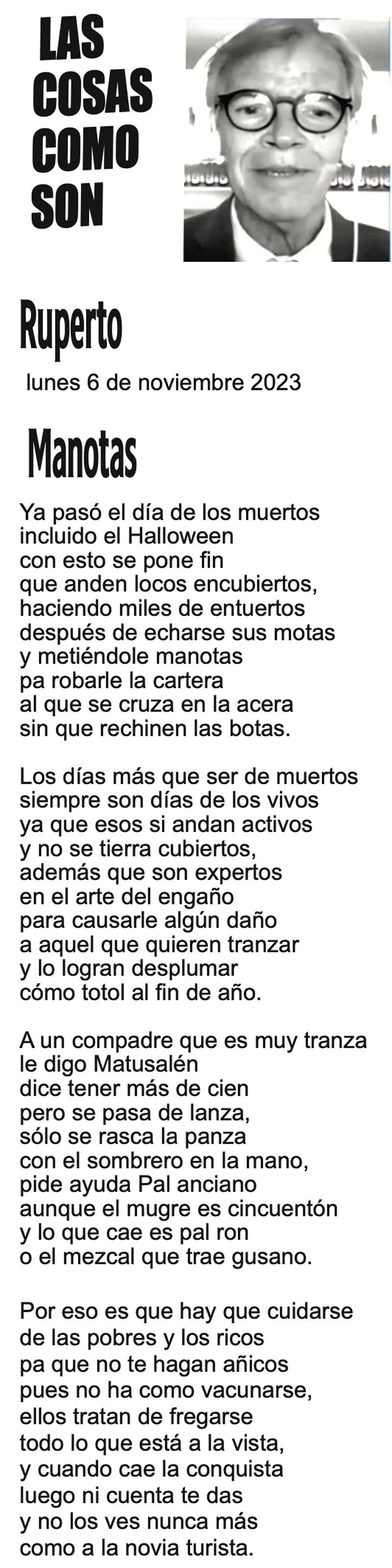 LAS COLUMNAS LAS COSAS COMO SON -MANOTAS MANOTAS... 6 noviembre 2023 Más Noticias LAS COSAS COMO SON | - MAS QUE UN DIARIO... TEXTO IRREVERENTE | LE VA A 'ECHAR GANITAS' - Al parecer, el asunto es 'chimoltrufiar' o sea lo mismo decir una cosa que otra. En marzo, el gobierno estatal informó que el programa de rehabilitación de carreteras y caminos conocido como "Bachetón"... ACERTIJOS | EL QUINTO PARTIDO - En la historia de los mundiales, México nunca ha jugado el quinto partido fuera de casa. Lo más que hemos alcanzado es el cuarto juego y de allí nos mandan a casa… A MIL POR HORA | - **Un matrimonio feliz **Apocalipsis jarocho **La isla de los pedófilos **“Amor con amor se paga”... A MIL POR HORA | - **Chicas más guapas **Días revolcados **Fascinantes artistas **Academia de Ególatras... CANCIONERO | EL PAN Y EL LLORO - Nada es accidental en la política. Este fin de semana, la señora presidente con A de patria tendrá una magna concentración de sus seguidores para celebrar el aniversario... TEXTO IRREVERENTE | ENNOCHEBUENADOS - La mercadotecnia adelanta todo y, ni modo, hay que lidiar con eso. Cuando todavía no acababa noviembre ya se vendían productos navideños y ahora mismo por doquiera se ven locales adornados con ese motivo... SIN TACTO | LAS VÍSPERAS - ¿Se acuerda la memorable lectora? ¿Recuerda el memorioso lector?: “Ya va llegando diciembre y sus posadas. Se va acercando ya también la Navidad. El año nuevo... LAS COSAS COMO SON - VAYA CINISMO... TEXTO IRREVERENTE | AÑO BUENO, AÑO MALO - El 2024 fue un año de suerte y abundancia. Este 2025 ha corrido en su contra con infortunio político y mediático. ¿‘Annus horribilis’? Tal vez no llega a tanto, pero sí desastroso y confirmatorio de sus...