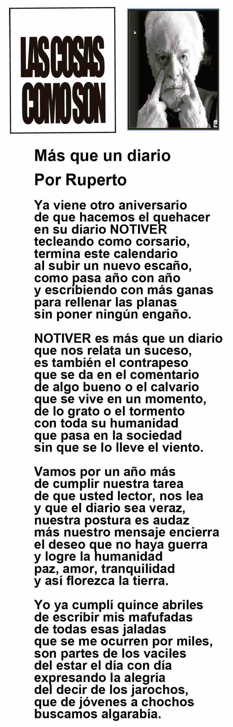 LAS COLUMNAS LAS COSAS COMO SON | - MAS QUE UN DIARIO... MAS QUE UN DIARIO... 5 diciembre 2025 Más Noticias A MIL POR HORA | - **Historia de 5 casadas **Lucha vs demonios **Dedazo Porfirista **El fut como el SIDA TEXTO IRREVERENTE | NO ES CÁNDIDA - La conversación pública en Veracruz se puso sino interesante al menos contestataria. Los que saben del asunto dividen a la conversación pública en tres espacios principales -no los únicos, pero sí los… ACERTIJOS | LAS PRIMAVERAS CANTORAS - Tengo un jardín bien cuidado, diario lo espío y el jardinero que es de La Perla, Joel, como si fuera de Versalles, lo tiene rechinando de limpio. Hace años me ha dado por darles de comer, antes les tiraba… CANCIONERO | LA TERMINOLOGÍA - En el principio era el Verbo, y el Verbo era Dios.Y el Verbo era con Dios. Lo sigue siendo: las cosas existen dependiendo de nuestra capacidad de darles nombre. La comunicación no existiría sin la convención de que… SIN TACTO | MÁS DE ZEPETA - Un amigo que gravita en el ámbito de Morena se comunica conmigo y me dice que le pareció apegado a la realidad política lo que publiqué en el “Sin tacto” de ayer sobre la suerte previsible de Esteban Ramírez Zepeta y su… CANCIONERO | EUTANASIA - Yo no tengo particular afecto por los animales llamados de compañía o mascotas, con las que seres solitarios procuran agenciarse afectos mediante el truco del perrito en el parque. Confieso que… A MIL POR HORA | - **Huérfanos mil niños **Hablar mal de Veracruz **Mesianismo jarocho **Fidel Castro en el café... SIN TACTO | SIGUE ZEPETA - En un despido que sigue el canon instaurado por la presidenta Claudia Sheinbaum, la dirigente nacional de Morena, Luisa María Alcalde Luján, fue invitada a ocupar la consejería jurídica de la Presidencia de la... TEXTO IRREVERENTE | ABRAZO FRATERNO - “Dios traerá con Jesús a los que se durmieron en Él” (1 Tesalonicenses 4:13). Desde acá va un abrazo solidario y fraterno para el periodista Luis Velásquez Rivera por la partida de su hermano... ACERTIJOS | LOS TIROTEOS EN LA TELE - Si uno llegara a conocer un nuevo país, suponiendo México, y comenzara a conocerlo y encendiera la tele para revisar el noticiero nocturno, qué bárbaro, pensarían que estamos en un campo de guerra y batalla...