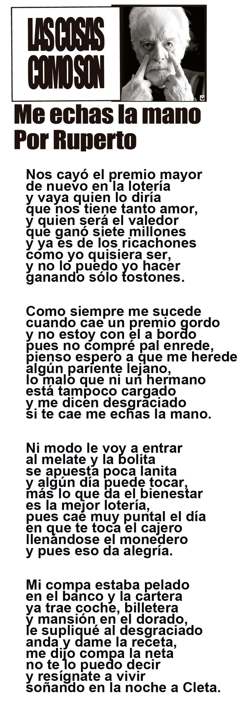 LAS COLUMNAS LAS COSAS COMO SON - ME ECHAS LA MANO... ME ECHAS LA MANO... 19 enero 2026 Más Noticias CANCIONERO | EUTANASIA - Yo no tengo particular afecto por los animales llamados de compañía o mascotas, con las que seres solitarios procuran agenciarse afectos mediante el truco del perrito en el parque. Confieso que… A MIL POR HORA | - **Huérfanos mil niños **Hablar mal de Veracruz **Mesianismo jarocho **Fidel Castro en el café... SIN TACTO | SIGUE ZEPETA - En un despido que sigue el canon instaurado por la presidenta Claudia Sheinbaum, la dirigente nacional de Morena, Luisa María Alcalde Luján, fue invitada a ocupar la consejería jurídica de la Presidencia de la... TEXTO IRREVERENTE | ABRAZO FRATERNO - “Dios traerá con Jesús a los que se durmieron en Él” (1 Tesalonicenses 4:13). Desde acá va un abrazo solidario y fraterno para el periodista Luis Velásquez Rivera por la partida de su hermano... ACERTIJOS | LOS TIROTEOS EN LA TELE - Si uno llegara a conocer un nuevo país, suponiendo México, y comenzara a conocerlo y encendiera la tele para revisar el noticiero nocturno, qué bárbaro, pensarían que estamos en un campo de guerra y batalla... ACERTIJOS | LOS 100 AÑOS DE JULIO SCHERER - Julio Scherer García murió en 2015. La unanimidad, esa flor rara, rodeó sus funerales con la corona de la admiración. En estos días cumplió cien años de su nacimiento y la prensa recuperó algo de... A MIL POR HORA | - **Perfil de un mexicano **El jarocho patriota **La lengua más larga **Estilo Porfiriano... SIN TACTO | LA UV DISCRIMINA A JUAN JOSÉ BARRIENTOS - Juan José Barrientos es un ave de tempestades, como corresponde a todo escritor genial. En su larga, larguísima trayectoria literaria ha acumulado estudios y experiencia que se han adjuntado… TEXTO IRREVERENTE | FASCISMO ANTIHUERTISTA - Antes fue deducción, ahora es certeza. Desde el congreso local que dirige Esteban Bautista se financian asambleas y propaganda para denostar al senador Manuel Huerta. Es decir, se utiliza el... CANCIONERO | INTELIGENCIA - No me pidan que sustente la veracidad de lo que voy a escribir enseguida, porque no puedo hacerlo; tampoco voy a proporcionar fuentes de información fidedignas, ni pruebas documentales confiables. No me las pidan...