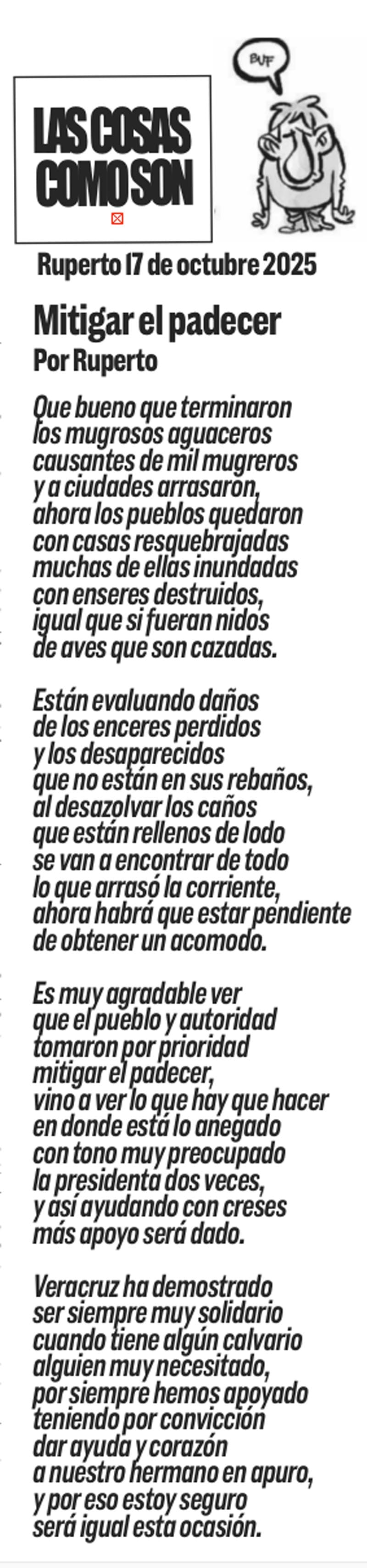 LAS COLUMNAS LAS COSAS COMO SON | - MITIGAR EL PADECER... MITIGAR EL PADECER... 17 octubre 2025 Más Noticias A MIL POR HORA | - **Chicas más guapas **Días revolcados **Fascinantes artistas **Academia de Ególatras... CANCIONERO | EL PAN Y EL LLORO - Nada es accidental en la política. Este fin de semana, la señora presidente con A de patria tendrá una magna concentración de sus seguidores para celebrar el aniversario... TEXTO IRREVERENTE | ENNOCHEBUENADOS - La mercadotecnia adelanta todo y, ni modo, hay que lidiar con eso. Cuando todavía no acababa noviembre ya se vendían productos navideños y ahora mismo por doquiera se ven locales adornados con ese motivo... SIN TACTO | LAS VÍSPERAS - ¿Se acuerda la memorable lectora? ¿Recuerda el memorioso lector?: “Ya va llegando diciembre y sus posadas. Se va acercando ya también la Navidad. El año nuevo... LAS COSAS COMO SON - VAYA CINISMO... TEXTO IRREVERENTE | AÑO BUENO, AÑO MALO - El 2024 fue un año de suerte y abundancia. Este 2025 ha corrido en su contra con infortunio político y mediático. ¿‘Annus horribilis’? Tal vez no llega a tanto, pero sí desastroso y confirmatorio de sus... SIN TACTO | ¿PORRAS A NOROÑA? - El cada vez más impresentable y alocado Gerardo Fernández Noroña le hizo el dudoso honor y el muy flaco favor a la gobernadora Rocío Nahle… ACERTIJOS | - Decía un gran columnista, que aunque fuera día de celebración o de cumple o de lo que sea, nunca hay que dejar de teclear algo, para seguir activos. Hoy es mi cumple... CANCIONERO | EL FISCAL INCÓMODO - Nadie pudo imaginar que un incidente en el concurso de Miss Universo, esa feria machista de la carne y la lascivia, disfrazada del más pueril nacionalismo, fuera a… A MIL POR HORA | - **Un día feliz **Amores prohibidos **$350 mil de recompensas **La política más joven...