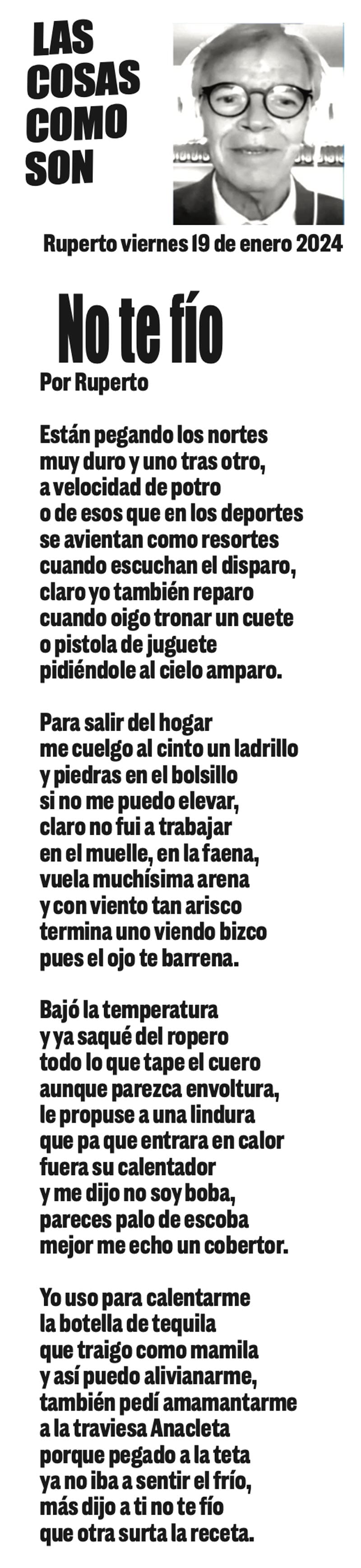 LAS COLUMNAS LAS COSAS COMO SON - NO TE FÍO... NO TE FÍO... 19 enero 2024 Más Noticias LAS COSAS COMO SON | - MAS QUE UN DIARIO... TEXTO IRREVERENTE | LE VA A 'ECHAR GANITAS' - Al parecer, el asunto es 'chimoltrufiar' o sea lo mismo decir una cosa que otra. En marzo, el gobierno estatal informó que el programa de rehabilitación de carreteras y caminos conocido como "Bachetón"... ACERTIJOS | EL QUINTO PARTIDO - En la historia de los mundiales, México nunca ha jugado el quinto partido fuera de casa. Lo más que hemos alcanzado es el cuarto juego y de allí nos mandan a casa… A MIL POR HORA | - **Un matrimonio feliz **Apocalipsis jarocho **La isla de los pedófilos **“Amor con amor se paga”... A MIL POR HORA | - **Chicas más guapas **Días revolcados **Fascinantes artistas **Academia de Ególatras... CANCIONERO | EL PAN Y EL LLORO - Nada es accidental en la política. Este fin de semana, la señora presidente con A de patria tendrá una magna concentración de sus seguidores para celebrar el aniversario... TEXTO IRREVERENTE | ENNOCHEBUENADOS - La mercadotecnia adelanta todo y, ni modo, hay que lidiar con eso. Cuando todavía no acababa noviembre ya se vendían productos navideños y ahora mismo por doquiera se ven locales adornados con ese motivo... SIN TACTO | LAS VÍSPERAS - ¿Se acuerda la memorable lectora? ¿Recuerda el memorioso lector?: “Ya va llegando diciembre y sus posadas. Se va acercando ya también la Navidad. El año nuevo... LAS COSAS COMO SON - VAYA CINISMO... TEXTO IRREVERENTE | AÑO BUENO, AÑO MALO - El 2024 fue un año de suerte y abundancia. Este 2025 ha corrido en su contra con infortunio político y mediático. ¿‘Annus horribilis’? Tal vez no llega a tanto, pero sí desastroso y confirmatorio de sus...