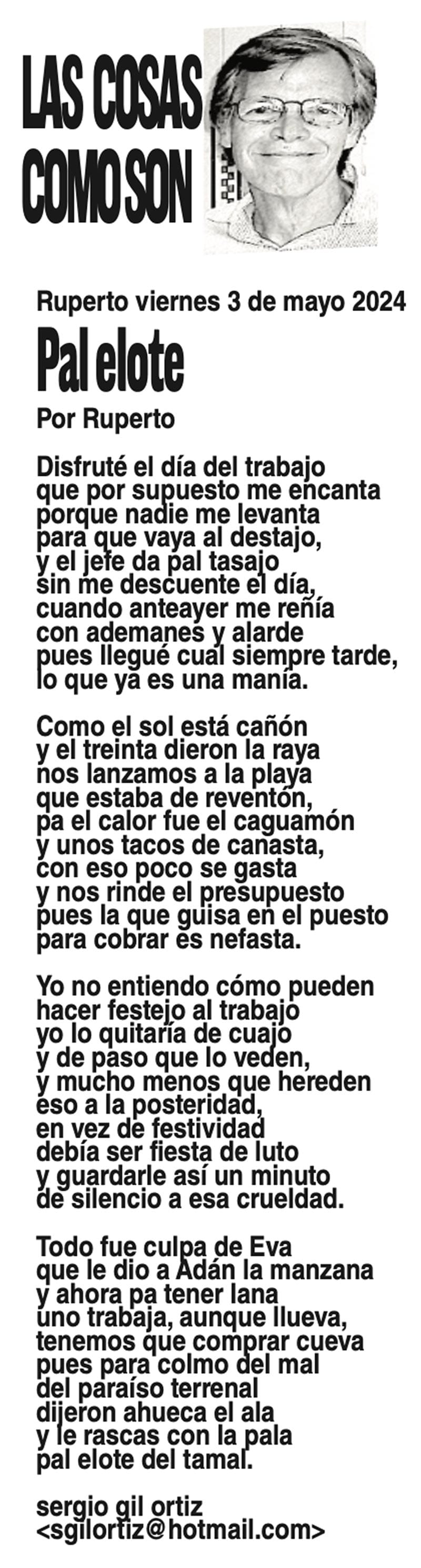LAS COLUMNAS LAS COSAS COMO SON | - PAL ELOTE PAL ELOTE... 3 mayo 2024 Más Noticias TEXTO IRREVERENTE | UN ARTE ETERNO - Envejecer haciendo periodismo no es sinónimo de obsolescencia ni de ser retardatario. La llamada ‘vieja guardia’ de la reporteada y del análisis periodístico... DIARIO DE UN REPORTERO | Y TODO ¿PARA QUÉ? - Tres días estuvo cerrado el centro de Xalapa porque se preparaba el escenario para el primer informe de la gobernadora Rocío Nahle. El tránsito... ACERTIJOS | NACEN LOS RIVALES EN FIFA - Es la mañana del sorteo de FIFA, en Washington, que amanece con un frio del carajo a 2 grados bajo cero y con caída de nieve. Llegan al Kennedy Center… A MIL POR HORA | - **5 películas icónicas **Seniles: bailar en casa **Marilyn y Chanel 5 **Sabroso quesito fundido... LAS COSAS COMO SON | - MAS QUE UN DIARIO... TEXTO IRREVERENTE | LE VA A 'ECHAR GANITAS' - Al parecer, el asunto es 'chimoltrufiar' o sea lo mismo decir una cosa que otra. En marzo, el gobierno estatal informó que el programa de rehabilitación de carreteras y caminos conocido como "Bachetón"... ACERTIJOS | EL QUINTO PARTIDO - En la historia de los mundiales, México nunca ha jugado el quinto partido fuera de casa. Lo más que hemos alcanzado es el cuarto juego y de allí nos mandan a casa… A MIL POR HORA | - **Un matrimonio feliz **Apocalipsis jarocho **La isla de los pedófilos **“Amor con amor se paga”... A MIL POR HORA | - **Chicas más guapas **Días revolcados **Fascinantes artistas **Academia de Ególatras... CANCIONERO | EL PAN Y EL LLORO - Nada es accidental en la política. Este fin de semana, la señora presidente con A de patria tendrá una magna concentración de sus seguidores para celebrar el aniversario...