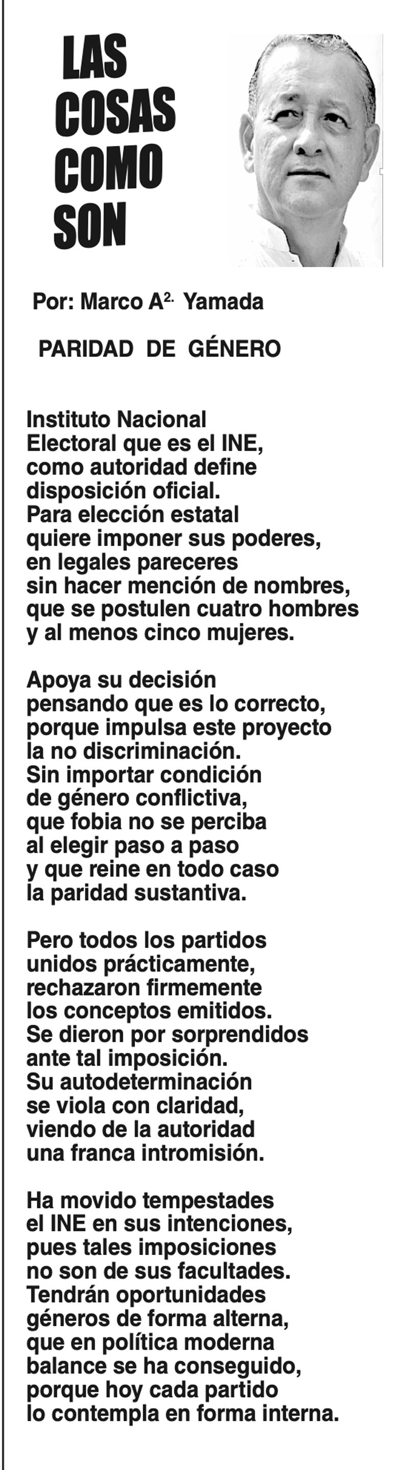 LAS COLUMNAS LAS COSAS COMO SON -PARIDAD DE GÉNERO PARIDAD DE GENERO... 12 octubre 2023 Más Noticias LAS COSAS COMO SON | - MAS QUE UN DIARIO... TEXTO IRREVERENTE | LE VA A 'ECHAR GANITAS' - Al parecer, el asunto es 'chimoltrufiar' o sea lo mismo decir una cosa que otra. En marzo, el gobierno estatal informó que el programa de rehabilitación de carreteras y caminos conocido como "Bachetón"... ACERTIJOS | EL QUINTO PARTIDO - En la historia de los mundiales, México nunca ha jugado el quinto partido fuera de casa. Lo más que hemos alcanzado es el cuarto juego y de allí nos mandan a casa… A MIL POR HORA | - **Un matrimonio feliz **Apocalipsis jarocho **La isla de los pedófilos **“Amor con amor se paga”... A MIL POR HORA | - **Chicas más guapas **Días revolcados **Fascinantes artistas **Academia de Ególatras... CANCIONERO | EL PAN Y EL LLORO - Nada es accidental en la política. Este fin de semana, la señora presidente con A de patria tendrá una magna concentración de sus seguidores para celebrar el aniversario... TEXTO IRREVERENTE | ENNOCHEBUENADOS - La mercadotecnia adelanta todo y, ni modo, hay que lidiar con eso. Cuando todavía no acababa noviembre ya se vendían productos navideños y ahora mismo por doquiera se ven locales adornados con ese motivo... SIN TACTO | LAS VÍSPERAS - ¿Se acuerda la memorable lectora? ¿Recuerda el memorioso lector?: “Ya va llegando diciembre y sus posadas. Se va acercando ya también la Navidad. El año nuevo... LAS COSAS COMO SON - VAYA CINISMO... TEXTO IRREVERENTE | AÑO BUENO, AÑO MALO - El 2024 fue un año de suerte y abundancia. Este 2025 ha corrido en su contra con infortunio político y mediático. ¿‘Annus horribilis’? Tal vez no llega a tanto, pero sí desastroso y confirmatorio de sus...