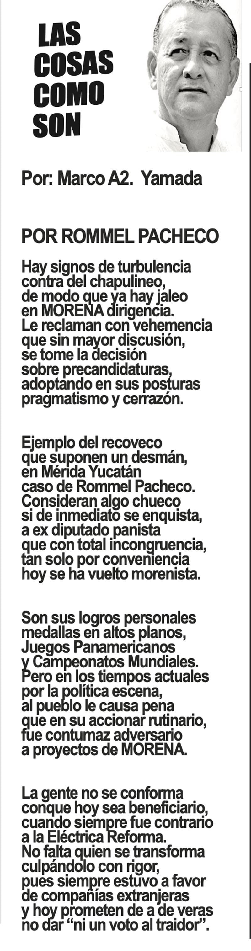 LAS COLUMNAS LAS COSAS COMO SON - POR ROMMEL PACHECO POR ROMMEL PACHECO... 4 enero 2024 Más Noticias CANCIONERO | EUTANASIA - Yo no tengo particular afecto por los animales llamados de compañía o mascotas, con las que seres solitarios procuran agenciarse afectos mediante el truco del perrito en el parque. Confieso que… A MIL POR HORA | - **Huérfanos mil niños **Hablar mal de Veracruz **Mesianismo jarocho **Fidel Castro en el café... SIN TACTO | SIGUE ZEPETA - En un despido que sigue el canon instaurado por la presidenta Claudia Sheinbaum, la dirigente nacional de Morena, Luisa María Alcalde Luján, fue invitada a ocupar la consejería jurídica de la Presidencia de la... TEXTO IRREVERENTE | ABRAZO FRATERNO - “Dios traerá con Jesús a los que se durmieron en Él” (1 Tesalonicenses 4:13). Desde acá va un abrazo solidario y fraterno para el periodista Luis Velásquez Rivera por la partida de su hermano... ACERTIJOS | LOS TIROTEOS EN LA TELE - Si uno llegara a conocer un nuevo país, suponiendo México, y comenzara a conocerlo y encendiera la tele para revisar el noticiero nocturno, qué bárbaro, pensarían que estamos en un campo de guerra y batalla... ACERTIJOS | LOS 100 AÑOS DE JULIO SCHERER - Julio Scherer García murió en 2015. La unanimidad, esa flor rara, rodeó sus funerales con la corona de la admiración. En estos días cumplió cien años de su nacimiento y la prensa recuperó algo de... A MIL POR HORA | - **Perfil de un mexicano **El jarocho patriota **La lengua más larga **Estilo Porfiriano... SIN TACTO | LA UV DISCRIMINA A JUAN JOSÉ BARRIENTOS - Juan José Barrientos es un ave de tempestades, como corresponde a todo escritor genial. En su larga, larguísima trayectoria literaria ha acumulado estudios y experiencia que se han adjuntado… TEXTO IRREVERENTE | FASCISMO ANTIHUERTISTA - Antes fue deducción, ahora es certeza. Desde el congreso local que dirige Esteban Bautista se financian asambleas y propaganda para denostar al senador Manuel Huerta. Es decir, se utiliza el... CANCIONERO | INTELIGENCIA - No me pidan que sustente la veracidad de lo que voy a escribir enseguida, porque no puedo hacerlo; tampoco voy a proporcionar fuentes de información fidedignas, ni pruebas documentales confiables. No me las pidan...