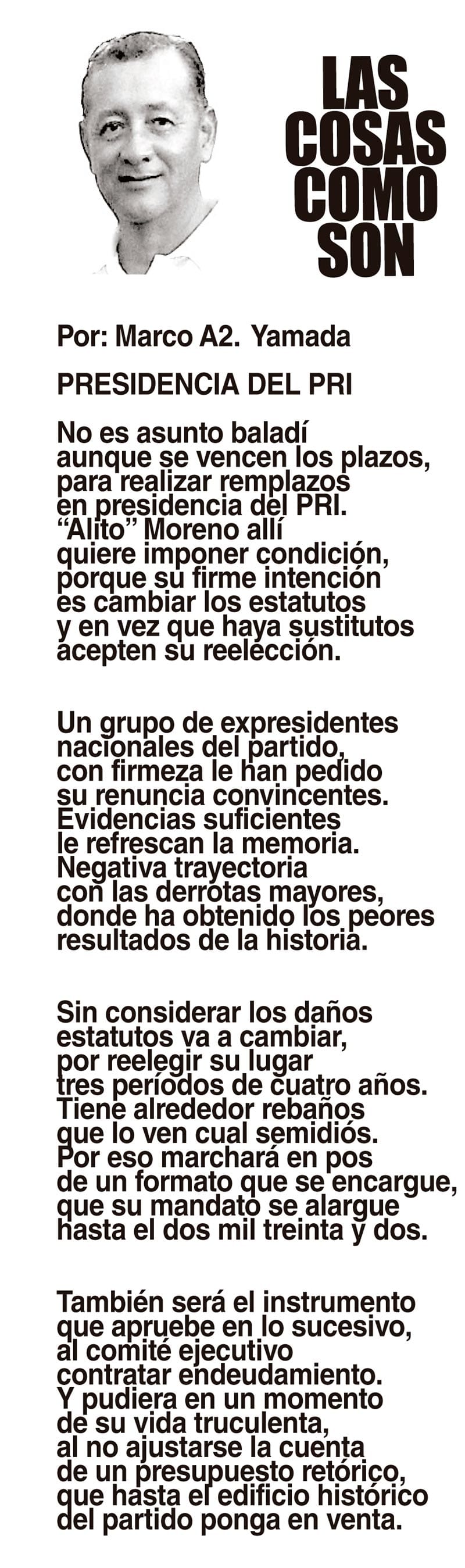 LAS COLUMNAS LAS COSAS COMO SON | - PRESIDENCIA DEL PRI PRESIDENCIA DEL PRI... 6 julio 2024 Más Noticias TEXTO IRREVERENTE | UN ARTE ETERNO - Envejecer haciendo periodismo no es sinónimo de obsolescencia ni de ser retardatario. La llamada ‘vieja guardia’ de la reporteada y del análisis periodístico... DIARIO DE UN REPORTERO | Y TODO ¿PARA QUÉ? - Tres días estuvo cerrado el centro de Xalapa porque se preparaba el escenario para el primer informe de la gobernadora Rocío Nahle. El tránsito... ACERTIJOS | NACEN LOS RIVALES EN FIFA - Es la mañana del sorteo de FIFA, en Washington, que amanece con un frio del carajo a 2 grados bajo cero y con caída de nieve. Llegan al Kennedy Center… A MIL POR HORA | - **5 películas icónicas **Seniles: bailar en casa **Marilyn y Chanel 5 **Sabroso quesito fundido... LAS COSAS COMO SON | - MAS QUE UN DIARIO... TEXTO IRREVERENTE | LE VA A 'ECHAR GANITAS' - Al parecer, el asunto es 'chimoltrufiar' o sea lo mismo decir una cosa que otra. En marzo, el gobierno estatal informó que el programa de rehabilitación de carreteras y caminos conocido como "Bachetón"... ACERTIJOS | EL QUINTO PARTIDO - En la historia de los mundiales, México nunca ha jugado el quinto partido fuera de casa. Lo más que hemos alcanzado es el cuarto juego y de allí nos mandan a casa… A MIL POR HORA | - **Un matrimonio feliz **Apocalipsis jarocho **La isla de los pedófilos **“Amor con amor se paga”... A MIL POR HORA | - **Chicas más guapas **Días revolcados **Fascinantes artistas **Academia de Ególatras... CANCIONERO | EL PAN Y EL LLORO - Nada es accidental en la política. Este fin de semana, la señora presidente con A de patria tendrá una magna concentración de sus seguidores para celebrar el aniversario...