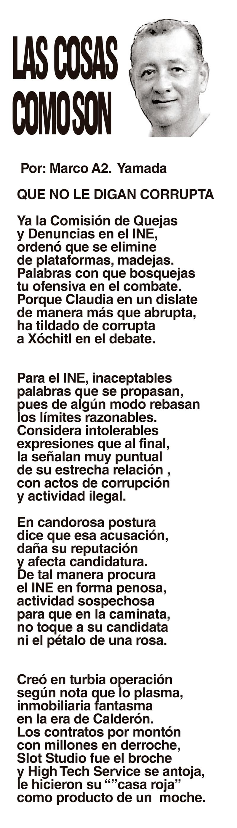LAS COLUMNAS LAS COSAS COMO SON | - QUE NO LE DIGAN CORRUPTA QUE NO LE DIGAN CORRUPTA... 18 mayo 2024 Más Noticias TEXTO IRREVERENTE | UN ARTE ETERNO - Envejecer haciendo periodismo no es sinónimo de obsolescencia ni de ser retardatario. La llamada ‘vieja guardia’ de la reporteada y del análisis periodístico... DIARIO DE UN REPORTERO | Y TODO ¿PARA QUÉ? - Tres días estuvo cerrado el centro de Xalapa porque se preparaba el escenario para el primer informe de la gobernadora Rocío Nahle. El tránsito... ACERTIJOS | NACEN LOS RIVALES EN FIFA - Es la mañana del sorteo de FIFA, en Washington, que amanece con un frio del carajo a 2 grados bajo cero y con caída de nieve. Llegan al Kennedy Center… A MIL POR HORA | - **5 películas icónicas **Seniles: bailar en casa **Marilyn y Chanel 5 **Sabroso quesito fundido... LAS COSAS COMO SON | - MAS QUE UN DIARIO... TEXTO IRREVERENTE | LE VA A 'ECHAR GANITAS' - Al parecer, el asunto es 'chimoltrufiar' o sea lo mismo decir una cosa que otra. En marzo, el gobierno estatal informó que el programa de rehabilitación de carreteras y caminos conocido como "Bachetón"... ACERTIJOS | EL QUINTO PARTIDO - En la historia de los mundiales, México nunca ha jugado el quinto partido fuera de casa. Lo más que hemos alcanzado es el cuarto juego y de allí nos mandan a casa… A MIL POR HORA | - **Un matrimonio feliz **Apocalipsis jarocho **La isla de los pedófilos **“Amor con amor se paga”... A MIL POR HORA | - **Chicas más guapas **Días revolcados **Fascinantes artistas **Academia de Ególatras... CANCIONERO | EL PAN Y EL LLORO - Nada es accidental en la política. Este fin de semana, la señora presidente con A de patria tendrá una magna concentración de sus seguidores para celebrar el aniversario...