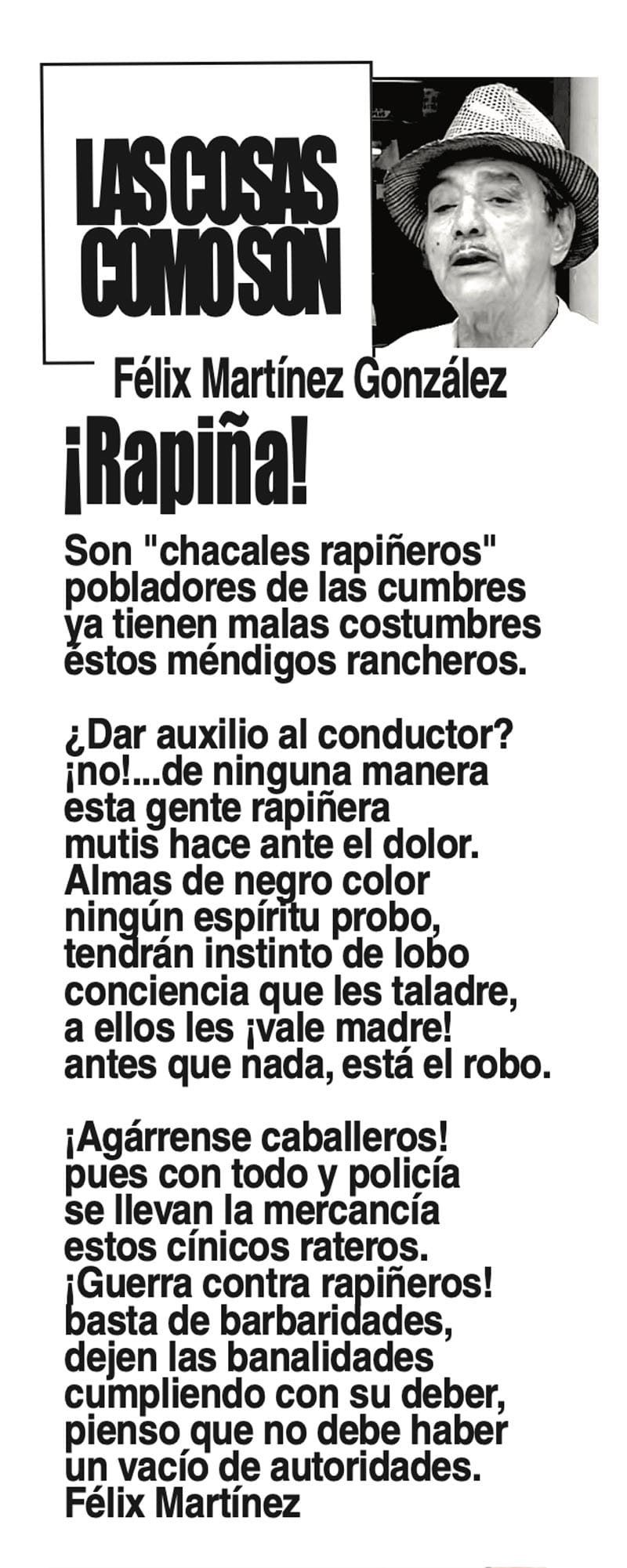 LAS COLUMNAS LAS COSAS COMO SON | - ¡RAPIÑA! ¡RAPIÑA!... 29 abril 2025 Más Noticias CANCIONERO | PIRATAS DEL CARIBE - A la pregunta de qué va a hacer con el petróleo que llevaba el barco tanque grandote llamado Skipper y con bandera falsa de Guyana, que sus fuerzas armadas... ACERTIJOS | LOS 51 AÑOS DE NOTIVER - Allá por los años 70s nacía Notiver. Un día Guadalupano por un asunto de festejo familiar. Desde aquel día de hace 51 años, que este 12 de diciembre se cumplen, el diario... TEXTO IRREVERENTE | - Monumental, mágico, misterioso y meritorio. Así definen arqueólogos y antropólogos a El Tajín, la ciudad prehispánica que se ubica cerca de Papantla, al norte veracruzano... A MIL POR HORA | - **Los duendes existen **Honrar al IMSS **Comadrita traviesa **Javier Duarte seguirá preso... TEXTO IRREVERENTE | CINCUENTA + UNO - La familia notiveriana está velando vísperas pues mañana es su fiesta magna, la que tiene lugar cada fin de otoño, ya pisando el invierno. El cumpleaños de NOTIVER comparte fecha... CANCIONERO | EL GOZO AL POZO...DE AGUA - Muy pronto se apagó el argüende mediático armado desde Palacio Nacional, en torno a la señora presidente con A de patria, celebrando con sonrisa pareja del primer ministro de Canadá, el bailoteo al ritmo de YMCA... SIN TACTO | 4T, LAS CUENTAS ALEGRES - Bueno, cuando menos podemos aceptar que los morenos en el poder tienen una capacidad: seguir al pie de la letra las instrucciones del librito que indica cómo responder y qué decir… ACERTIJOS | POR LOS 51 DE NOTIVER - Un día antes auguraban un gran Norte, que entró en lunes. Al iniciar semana. Cotidianamente llegó con mi hermano Enrique, con Fernando Pavón, biógrafo de Tierra Blanca y el amigo... 51 Y CONTANDO… | - Medio siglo y un año, no se escribe ni fácil ni sin derramar una que otra lagrimilla: 51 años de éste su periódico NOTIVER. La Noticia en el momento que sucede, es un acontecimiento más... A MIL POR HORA | - **Migrante exitoso **Genio universal **Manipulador de mujeres **Ley vs vapeadores...