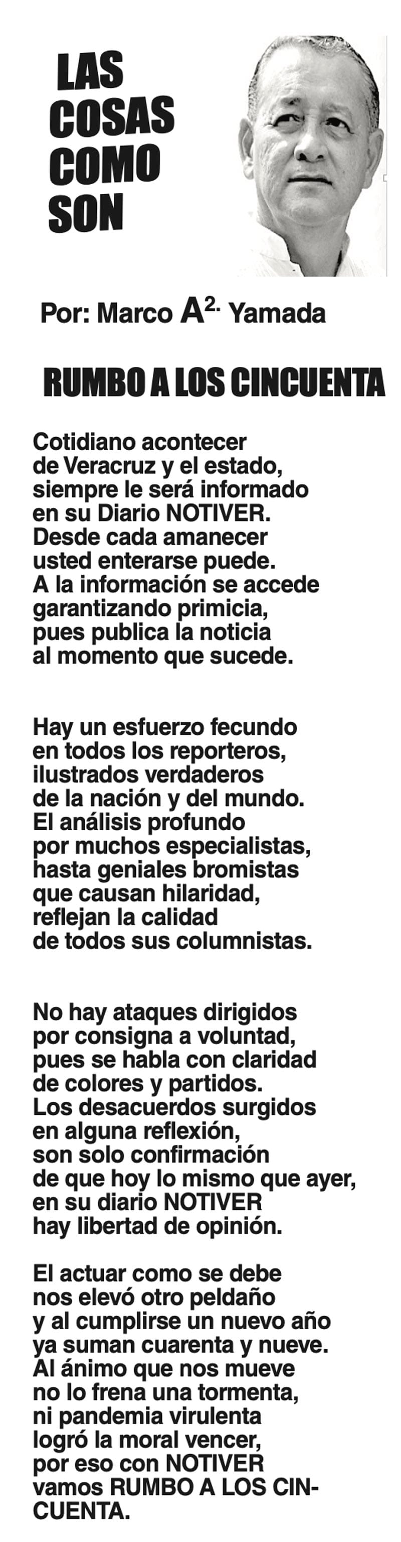LAS COLUMNAS LAS COSAS COMO SON - RUMBO A LOS CINCUENTA RUMBO A LOS CINCUENTA... 12 diciembre 2023 Más Noticias LAS COSAS COMO SON | - MAS QUE UN DIARIO... TEXTO IRREVERENTE | LE VA A 'ECHAR GANITAS' - Al parecer, el asunto es 'chimoltrufiar' o sea lo mismo decir una cosa que otra. En marzo, el gobierno estatal informó que el programa de rehabilitación de carreteras y caminos conocido como "Bachetón"... ACERTIJOS | EL QUINTO PARTIDO - En la historia de los mundiales, México nunca ha jugado el quinto partido fuera de casa. Lo más que hemos alcanzado es el cuarto juego y de allí nos mandan a casa… A MIL POR HORA | - **Un matrimonio feliz **Apocalipsis jarocho **La isla de los pedófilos **“Amor con amor se paga”... A MIL POR HORA | - **Chicas más guapas **Días revolcados **Fascinantes artistas **Academia de Ególatras... CANCIONERO | EL PAN Y EL LLORO - Nada es accidental en la política. Este fin de semana, la señora presidente con A de patria tendrá una magna concentración de sus seguidores para celebrar el aniversario... TEXTO IRREVERENTE | ENNOCHEBUENADOS - La mercadotecnia adelanta todo y, ni modo, hay que lidiar con eso. Cuando todavía no acababa noviembre ya se vendían productos navideños y ahora mismo por doquiera se ven locales adornados con ese motivo... SIN TACTO | LAS VÍSPERAS - ¿Se acuerda la memorable lectora? ¿Recuerda el memorioso lector?: “Ya va llegando diciembre y sus posadas. Se va acercando ya también la Navidad. El año nuevo... LAS COSAS COMO SON - VAYA CINISMO... TEXTO IRREVERENTE | AÑO BUENO, AÑO MALO - El 2024 fue un año de suerte y abundancia. Este 2025 ha corrido en su contra con infortunio político y mediático. ¿‘Annus horribilis’? Tal vez no llega a tanto, pero sí desastroso y confirmatorio de sus...