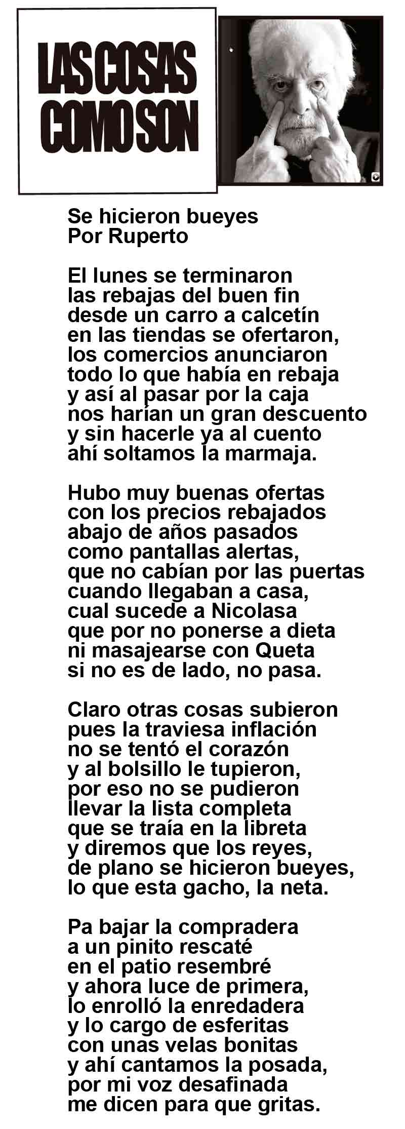 LAS COLUMNAS LAS COSAS COMO SON - SE HICIERON BUEYES... SE HICIERON BUEYES... 21 noviembre 2025 Más Noticias TEXTO IRREVERENTE | HISTORIAS NECESARIAS - “Cuando Woody tenía 2 años en la guardería les dijeron a sus padres que algo estaba mal, no respondía a las instrucciones básicas. Las pruebas demostraron que era autista grave”. Luego “los médicos… A MIL POR HORA | - **Grandes ilusiones **Peores políticos **Empleos en Veracruz **En misión periodística A MIL POR HORA | - **Historia de 5 casadas **Lucha vs demonios **Dedazo Porfirista **El fut como el SIDA TEXTO IRREVERENTE | NO ES CÁNDIDA - La conversación pública en Veracruz se puso sino interesante al menos contestataria. Los que saben del asunto dividen a la conversación pública en tres espacios principales -no los únicos, pero sí los… ACERTIJOS | LAS PRIMAVERAS CANTORAS - Tengo un jardín bien cuidado, diario lo espío y el jardinero que es de La Perla, Joel, como si fuera de Versalles, lo tiene rechinando de limpio. Hace años me ha dado por darles de comer, antes les tiraba… CANCIONERO | LA TERMINOLOGÍA - En el principio era el Verbo, y el Verbo era Dios.Y el Verbo era con Dios. Lo sigue siendo: las cosas existen dependiendo de nuestra capacidad de darles nombre. La comunicación no existiría sin la convención de que… SIN TACTO | MÁS DE ZEPETA - Un amigo que gravita en el ámbito de Morena se comunica conmigo y me dice que le pareció apegado a la realidad política lo que publiqué en el “Sin tacto” de ayer sobre la suerte previsible de Esteban Ramírez Zepeta y su… CANCIONERO | EUTANASIA - Yo no tengo particular afecto por los animales llamados de compañía o mascotas, con las que seres solitarios procuran agenciarse afectos mediante el truco del perrito en el parque. Confieso que… A MIL POR HORA | - **Huérfanos mil niños **Hablar mal de Veracruz **Mesianismo jarocho **Fidel Castro en el café... SIN TACTO | SIGUE ZEPETA - En un despido que sigue el canon instaurado por la presidenta Claudia Sheinbaum, la dirigente nacional de Morena, Luisa María Alcalde Luján, fue invitada a ocupar la consejería jurídica de la Presidencia de la...