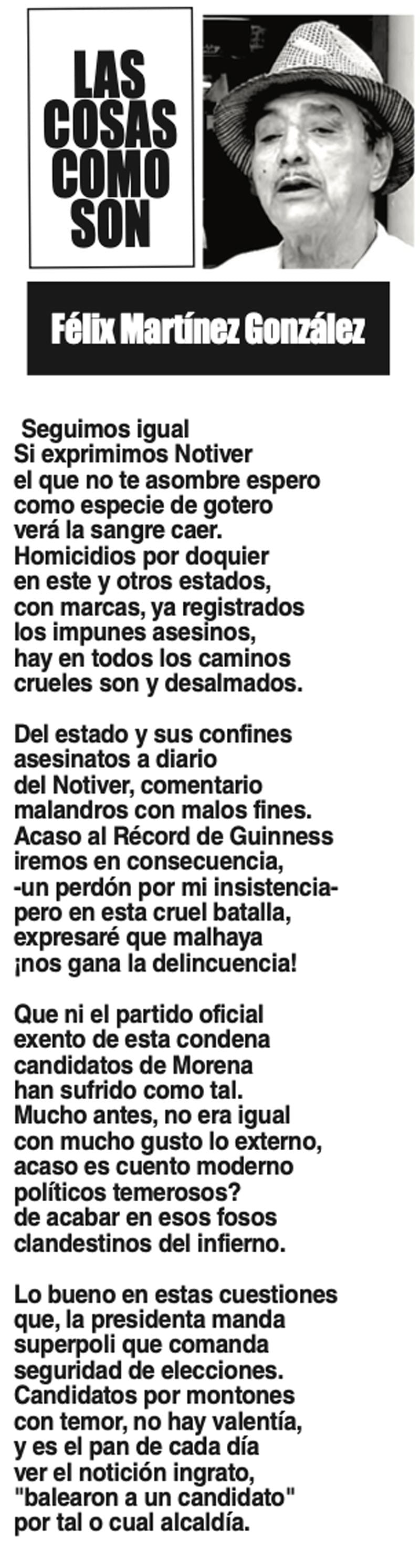 LAS COLUMNAS LAS COSAS COMO SON | - SEGUIMOS IGUAL SEGUIMOS IGUAL... 22 mayo 2025 Más Noticias CANCIONERO | PIRATAS DEL CARIBE - A la pregunta de qué va a hacer con el petróleo que llevaba el barco tanque grandote llamado Skipper y con bandera falsa de Guyana, que sus fuerzas armadas... ACERTIJOS | LOS 51 AÑOS DE NOTIVER - Allá por los años 70s nacía Notiver. Un día Guadalupano por un asunto de festejo familiar. Desde aquel día de hace 51 años, que este 12 de diciembre se cumplen, el diario... TEXTO IRREVERENTE | - Monumental, mágico, misterioso y meritorio. Así definen arqueólogos y antropólogos a El Tajín, la ciudad prehispánica que se ubica cerca de Papantla, al norte veracruzano... A MIL POR HORA | - **Los duendes existen **Honrar al IMSS **Comadrita traviesa **Javier Duarte seguirá preso... TEXTO IRREVERENTE | CINCUENTA + UNO - La familia notiveriana está velando vísperas pues mañana es su fiesta magna, la que tiene lugar cada fin de otoño, ya pisando el invierno. El cumpleaños de NOTIVER comparte fecha... CANCIONERO | EL GOZO AL POZO...DE AGUA - Muy pronto se apagó el argüende mediático armado desde Palacio Nacional, en torno a la señora presidente con A de patria, celebrando con sonrisa pareja del primer ministro de Canadá, el bailoteo al ritmo de YMCA... SIN TACTO | 4T, LAS CUENTAS ALEGRES - Bueno, cuando menos podemos aceptar que los morenos en el poder tienen una capacidad: seguir al pie de la letra las instrucciones del librito que indica cómo responder y qué decir… ACERTIJOS | POR LOS 51 DE NOTIVER - Un día antes auguraban un gran Norte, que entró en lunes. Al iniciar semana. Cotidianamente llegó con mi hermano Enrique, con Fernando Pavón, biógrafo de Tierra Blanca y el amigo... 51 Y CONTANDO… | - Medio siglo y un año, no se escribe ni fácil ni sin derramar una que otra lagrimilla: 51 años de éste su periódico NOTIVER. La Noticia en el momento que sucede, es un acontecimiento más... A MIL POR HORA | - **Migrante exitoso **Genio universal **Manipulador de mujeres **Ley vs vapeadores...