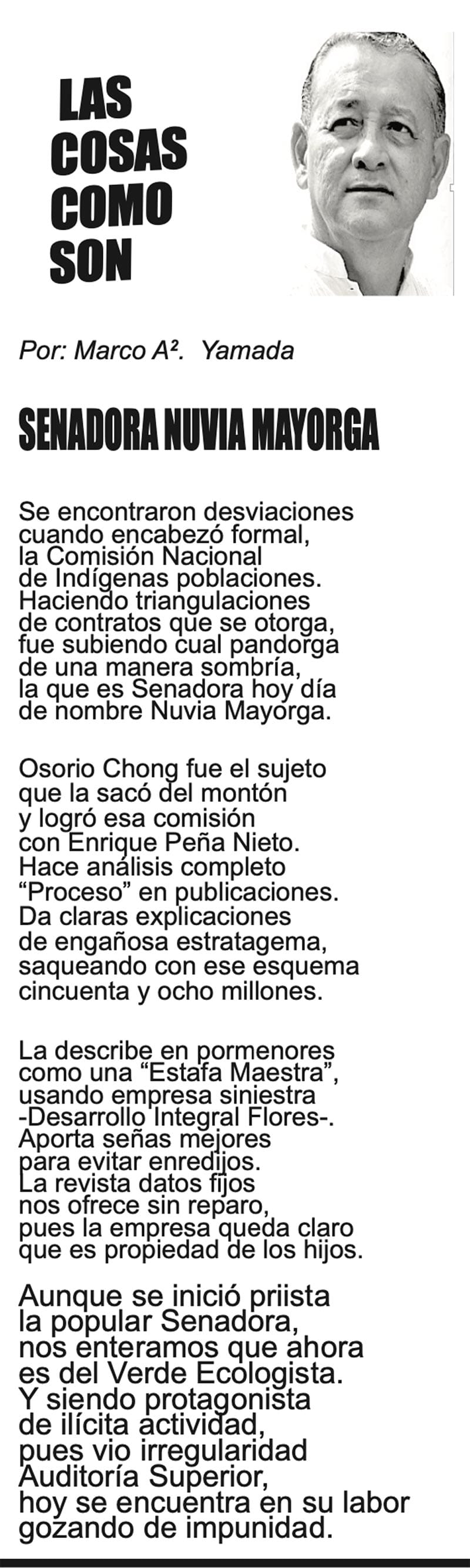 LAS COLUMNAS LAS COSAS COMO SON - SENADORA NUVIA MAYORGA SENADORA NUVIA MAYORGA... 13 febrero 2024 Más Noticias TEXTO IRREVERENTE | HISTORIAS NECESARIAS - “Cuando Woody tenía 2 años en la guardería les dijeron a sus padres que algo estaba mal, no respondía a las instrucciones básicas. Las pruebas demostraron que era autista grave”. Luego “los médicos… A MIL POR HORA | - **Grandes ilusiones **Peores políticos **Empleos en Veracruz **En misión periodística A MIL POR HORA | - **Historia de 5 casadas **Lucha vs demonios **Dedazo Porfirista **El fut como el SIDA TEXTO IRREVERENTE | NO ES CÁNDIDA - La conversación pública en Veracruz se puso sino interesante al menos contestataria. Los que saben del asunto dividen a la conversación pública en tres espacios principales -no los únicos, pero sí los… ACERTIJOS | LAS PRIMAVERAS CANTORAS - Tengo un jardín bien cuidado, diario lo espío y el jardinero que es de La Perla, Joel, como si fuera de Versalles, lo tiene rechinando de limpio. Hace años me ha dado por darles de comer, antes les tiraba… CANCIONERO | LA TERMINOLOGÍA - En el principio era el Verbo, y el Verbo era Dios.Y el Verbo era con Dios. Lo sigue siendo: las cosas existen dependiendo de nuestra capacidad de darles nombre. La comunicación no existiría sin la convención de que… SIN TACTO | MÁS DE ZEPETA - Un amigo que gravita en el ámbito de Morena se comunica conmigo y me dice que le pareció apegado a la realidad política lo que publiqué en el “Sin tacto” de ayer sobre la suerte previsible de Esteban Ramírez Zepeta y su… CANCIONERO | EUTANASIA - Yo no tengo particular afecto por los animales llamados de compañía o mascotas, con las que seres solitarios procuran agenciarse afectos mediante el truco del perrito en el parque. Confieso que… A MIL POR HORA | - **Huérfanos mil niños **Hablar mal de Veracruz **Mesianismo jarocho **Fidel Castro en el café... SIN TACTO | SIGUE ZEPETA - En un despido que sigue el canon instaurado por la presidenta Claudia Sheinbaum, la dirigente nacional de Morena, Luisa María Alcalde Luján, fue invitada a ocupar la consejería jurídica de la Presidencia de la...