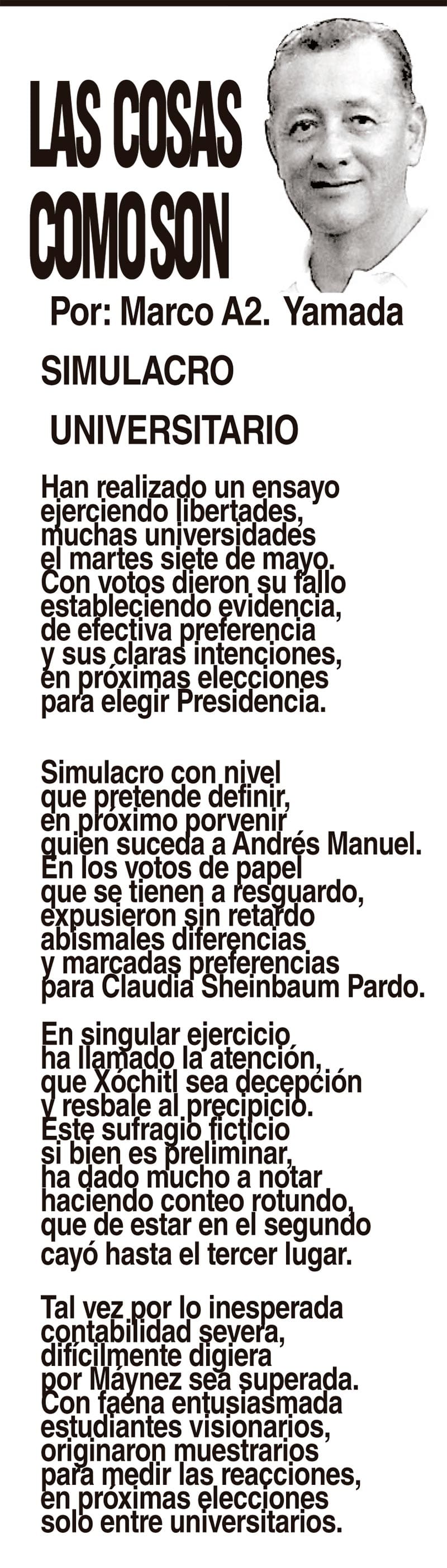 LAS COLUMNAS LAS COSAS COMO SON | - SIMULACRO UNIVERSITARIO SIMULACRO UNIVERSITARIO... 11 mayo 2024 Más Noticias LAS COSAS COMO SON | - MAS QUE UN DIARIO... TEXTO IRREVERENTE | LE VA A 'ECHAR GANITAS' - Al parecer, el asunto es 'chimoltrufiar' o sea lo mismo decir una cosa que otra. En marzo, el gobierno estatal informó que el programa de rehabilitación de carreteras y caminos conocido como "Bachetón"... ACERTIJOS | EL QUINTO PARTIDO - En la historia de los mundiales, México nunca ha jugado el quinto partido fuera de casa. Lo más que hemos alcanzado es el cuarto juego y de allí nos mandan a casa… A MIL POR HORA | - **Un matrimonio feliz **Apocalipsis jarocho **La isla de los pedófilos **“Amor con amor se paga”... A MIL POR HORA | - **Chicas más guapas **Días revolcados **Fascinantes artistas **Academia de Ególatras... CANCIONERO | EL PAN Y EL LLORO - Nada es accidental en la política. Este fin de semana, la señora presidente con A de patria tendrá una magna concentración de sus seguidores para celebrar el aniversario... TEXTO IRREVERENTE | ENNOCHEBUENADOS - La mercadotecnia adelanta todo y, ni modo, hay que lidiar con eso. Cuando todavía no acababa noviembre ya se vendían productos navideños y ahora mismo por doquiera se ven locales adornados con ese motivo... SIN TACTO | LAS VÍSPERAS - ¿Se acuerda la memorable lectora? ¿Recuerda el memorioso lector?: “Ya va llegando diciembre y sus posadas. Se va acercando ya también la Navidad. El año nuevo... LAS COSAS COMO SON - VAYA CINISMO... TEXTO IRREVERENTE | AÑO BUENO, AÑO MALO - El 2024 fue un año de suerte y abundancia. Este 2025 ha corrido en su contra con infortunio político y mediático. ¿‘Annus horribilis’? Tal vez no llega a tanto, pero sí desastroso y confirmatorio de sus...