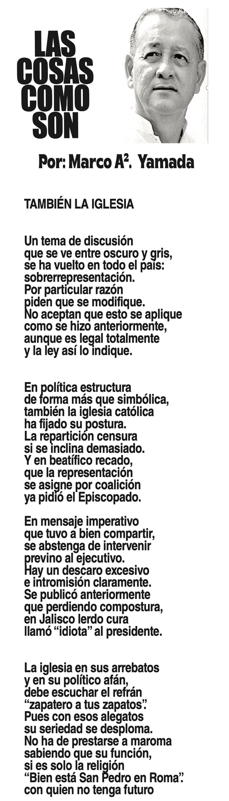 LAS COLUMNAS LAS COSAS COMO SON | - TAMBIÉN LA IGLESIA TAMBIÉN LA IGLESIA... 22 agosto 2024 Más Noticias TEXTO IRREVERENTE | UN ARTE ETERNO - Envejecer haciendo periodismo no es sinónimo de obsolescencia ni de ser retardatario. La llamada ‘vieja guardia’ de la reporteada y del análisis periodístico... DIARIO DE UN REPORTERO | Y TODO ¿PARA QUÉ? - Tres días estuvo cerrado el centro de Xalapa porque se preparaba el escenario para el primer informe de la gobernadora Rocío Nahle. El tránsito... ACERTIJOS | NACEN LOS RIVALES EN FIFA - Es la mañana del sorteo de FIFA, en Washington, que amanece con un frio del carajo a 2 grados bajo cero y con caída de nieve. Llegan al Kennedy Center… A MIL POR HORA | - **5 películas icónicas **Seniles: bailar en casa **Marilyn y Chanel 5 **Sabroso quesito fundido... LAS COSAS COMO SON | - MAS QUE UN DIARIO... TEXTO IRREVERENTE | LE VA A 'ECHAR GANITAS' - Al parecer, el asunto es 'chimoltrufiar' o sea lo mismo decir una cosa que otra. En marzo, el gobierno estatal informó que el programa de rehabilitación de carreteras y caminos conocido como "Bachetón"... ACERTIJOS | EL QUINTO PARTIDO - En la historia de los mundiales, México nunca ha jugado el quinto partido fuera de casa. Lo más que hemos alcanzado es el cuarto juego y de allí nos mandan a casa… A MIL POR HORA | - **Un matrimonio feliz **Apocalipsis jarocho **La isla de los pedófilos **“Amor con amor se paga”... A MIL POR HORA | - **Chicas más guapas **Días revolcados **Fascinantes artistas **Academia de Ególatras... CANCIONERO | EL PAN Y EL LLORO - Nada es accidental en la política. Este fin de semana, la señora presidente con A de patria tendrá una magna concentración de sus seguidores para celebrar el aniversario...
