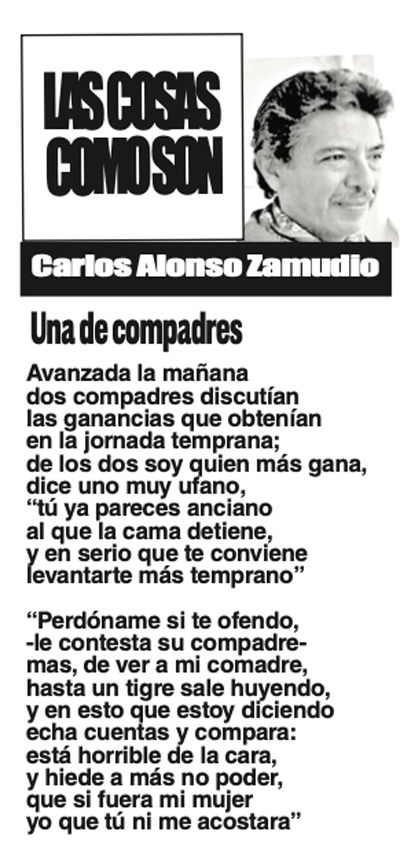 LAS COLUMNAS LAS COSAS COMO SON - UNA DE COMPADRES... UNA DE COMPADRES... 12 noviembre 2025 Más Noticias A MIL POR HORA | - **Historia de 5 casadas **Lucha vs demonios **Dedazo Porfirista **El fut como el SIDA TEXTO IRREVERENTE | NO ES CÁNDIDA - La conversación pública en Veracruz se puso sino interesante al menos contestataria. Los que saben del asunto dividen a la conversación pública en tres espacios principales -no los únicos, pero sí los… ACERTIJOS | LAS PRIMAVERAS CANTORAS - Tengo un jardín bien cuidado, diario lo espío y el jardinero que es de La Perla, Joel, como si fuera de Versalles, lo tiene rechinando de limpio. Hace años me ha dado por darles de comer, antes les tiraba… CANCIONERO | LA TERMINOLOGÍA - En el principio era el Verbo, y el Verbo era Dios.Y el Verbo era con Dios. Lo sigue siendo: las cosas existen dependiendo de nuestra capacidad de darles nombre. La comunicación no existiría sin la convención de que… SIN TACTO | MÁS DE ZEPETA - Un amigo que gravita en el ámbito de Morena se comunica conmigo y me dice que le pareció apegado a la realidad política lo que publiqué en el “Sin tacto” de ayer sobre la suerte previsible de Esteban Ramírez Zepeta y su… CANCIONERO | EUTANASIA - Yo no tengo particular afecto por los animales llamados de compañía o mascotas, con las que seres solitarios procuran agenciarse afectos mediante el truco del perrito en el parque. Confieso que… A MIL POR HORA | - **Huérfanos mil niños **Hablar mal de Veracruz **Mesianismo jarocho **Fidel Castro en el café... SIN TACTO | SIGUE ZEPETA - En un despido que sigue el canon instaurado por la presidenta Claudia Sheinbaum, la dirigente nacional de Morena, Luisa María Alcalde Luján, fue invitada a ocupar la consejería jurídica de la Presidencia de la... TEXTO IRREVERENTE | ABRAZO FRATERNO - “Dios traerá con Jesús a los que se durmieron en Él” (1 Tesalonicenses 4:13). Desde acá va un abrazo solidario y fraterno para el periodista Luis Velásquez Rivera por la partida de su hermano... ACERTIJOS | LOS TIROTEOS EN LA TELE - Si uno llegara a conocer un nuevo país, suponiendo México, y comenzara a conocerlo y encendiera la tele para revisar el noticiero nocturno, qué bárbaro, pensarían que estamos en un campo de guerra y batalla...