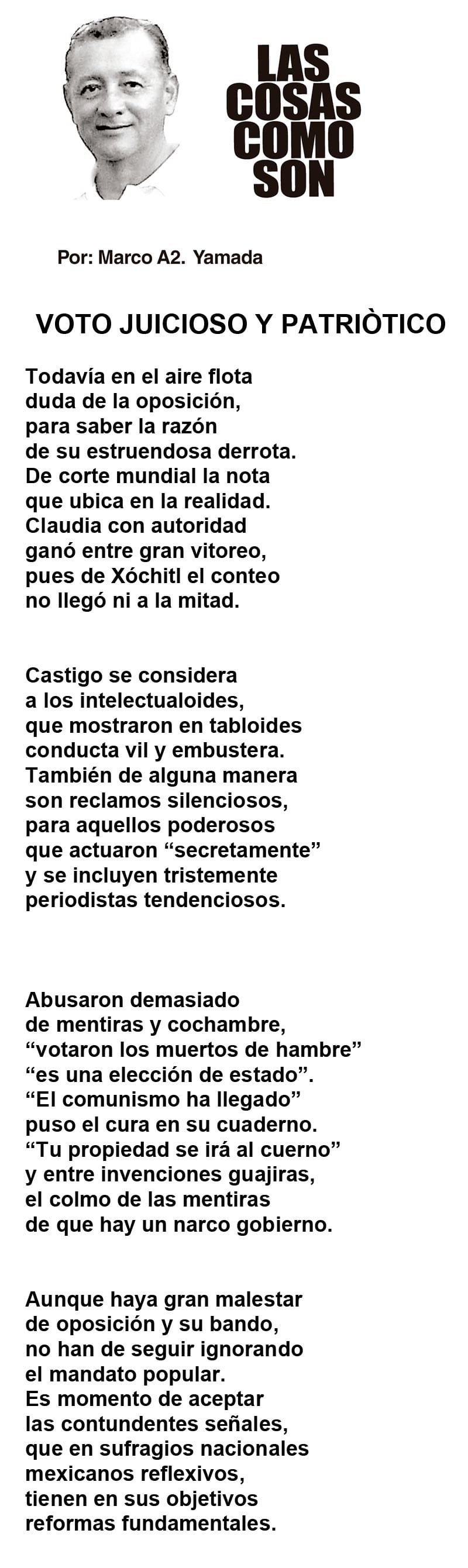 LAS COLUMNAS LAS COSAS COMO SON | - VOTO JUICIOSO Y PATRIÓTICO VOTO JUICIOSO Y PATRIÓTICO... 7 junio 2024 Más Noticias A MIL POR HORA | - **Chicas más guapas **Días revolcados **Fascinantes artistas **Academia de Ególatras... CANCIONERO | EL PAN Y EL LLORO - Nada es accidental en la política. Este fin de semana, la señora presidente con A de patria tendrá una magna concentración de sus seguidores para celebrar el aniversario... TEXTO IRREVERENTE | ENNOCHEBUENADOS - La mercadotecnia adelanta todo y, ni modo, hay que lidiar con eso. Cuando todavía no acababa noviembre ya se vendían productos navideños y ahora mismo por doquiera se ven locales adornados con ese motivo... SIN TACTO | LAS VÍSPERAS - ¿Se acuerda la memorable lectora? ¿Recuerda el memorioso lector?: “Ya va llegando diciembre y sus posadas. Se va acercando ya también la Navidad. El año nuevo... LAS COSAS COMO SON - VAYA CINISMO... TEXTO IRREVERENTE | AÑO BUENO, AÑO MALO - El 2024 fue un año de suerte y abundancia. Este 2025 ha corrido en su contra con infortunio político y mediático. ¿‘Annus horribilis’? Tal vez no llega a tanto, pero sí desastroso y confirmatorio de sus... SIN TACTO | ¿PORRAS A NOROÑA? - El cada vez más impresentable y alocado Gerardo Fernández Noroña le hizo el dudoso honor y el muy flaco favor a la gobernadora Rocío Nahle… ACERTIJOS | - Decía un gran columnista, que aunque fuera día de celebración o de cumple o de lo que sea, nunca hay que dejar de teclear algo, para seguir activos. Hoy es mi cumple... CANCIONERO | EL FISCAL INCÓMODO - Nadie pudo imaginar que un incidente en el concurso de Miss Universo, esa feria machista de la carne y la lascivia, disfrazada del más pueril nacionalismo, fuera a… A MIL POR HORA | - **Un día feliz **Amores prohibidos **$350 mil de recompensas **La política más joven...