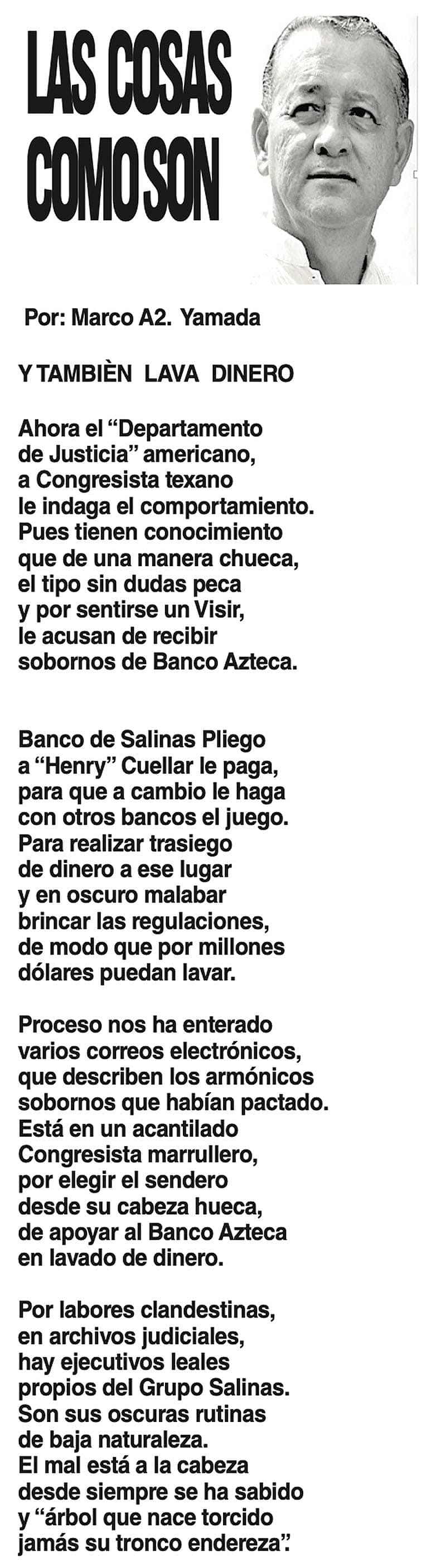 LAS COLUMNAS LAS COSAS COMO SON | - Y TAMBIÉN LAVA DINERO Y TAMBIÉN LAVA DINERO... 7 mayo 2024 Más Noticias LAS COSAS COMO SON | - MAS QUE UN DIARIO... TEXTO IRREVERENTE | LE VA A 'ECHAR GANITAS' - Al parecer, el asunto es 'chimoltrufiar' o sea lo mismo decir una cosa que otra. En marzo, el gobierno estatal informó que el programa de rehabilitación de carreteras y caminos conocido como "Bachetón"... ACERTIJOS | EL QUINTO PARTIDO - En la historia de los mundiales, México nunca ha jugado el quinto partido fuera de casa. Lo más que hemos alcanzado es el cuarto juego y de allí nos mandan a casa… A MIL POR HORA | - **Un matrimonio feliz **Apocalipsis jarocho **La isla de los pedófilos **“Amor con amor se paga”... A MIL POR HORA | - **Chicas más guapas **Días revolcados **Fascinantes artistas **Academia de Ególatras... CANCIONERO | EL PAN Y EL LLORO - Nada es accidental en la política. Este fin de semana, la señora presidente con A de patria tendrá una magna concentración de sus seguidores para celebrar el aniversario... TEXTO IRREVERENTE | ENNOCHEBUENADOS - La mercadotecnia adelanta todo y, ni modo, hay que lidiar con eso. Cuando todavía no acababa noviembre ya se vendían productos navideños y ahora mismo por doquiera se ven locales adornados con ese motivo... SIN TACTO | LAS VÍSPERAS - ¿Se acuerda la memorable lectora? ¿Recuerda el memorioso lector?: “Ya va llegando diciembre y sus posadas. Se va acercando ya también la Navidad. El año nuevo... LAS COSAS COMO SON - VAYA CINISMO... TEXTO IRREVERENTE | AÑO BUENO, AÑO MALO - El 2024 fue un año de suerte y abundancia. Este 2025 ha corrido en su contra con infortunio político y mediático. ¿‘Annus horribilis’? Tal vez no llega a tanto, pero sí desastroso y confirmatorio de sus...