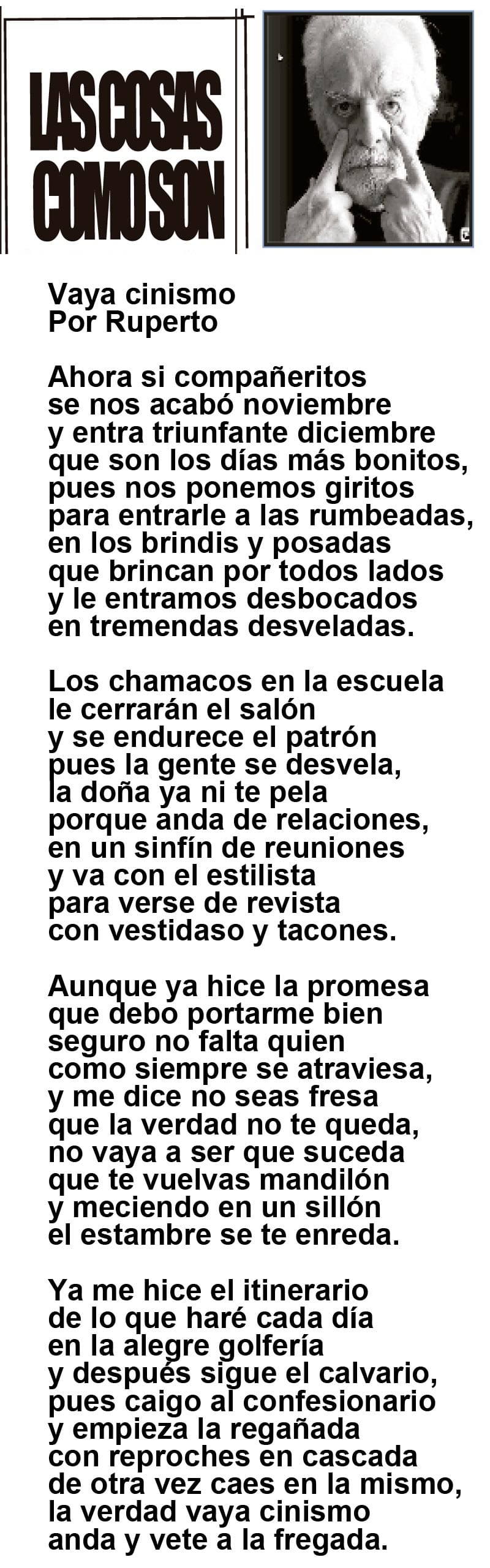 LAS COLUMNAS LAS COSAS COMO SON - VAYA CINISMO... VAYA CINISMO... 1 diciembre 2025 Más Noticias A MIL POR HORA | - **Historia de 5 casadas **Lucha vs demonios **Dedazo Porfirista **El fut como el SIDA TEXTO IRREVERENTE | NO ES CÁNDIDA - La conversación pública en Veracruz se puso sino interesante al menos contestataria. Los que saben del asunto dividen a la conversación pública en tres espacios principales -no los únicos, pero sí los… ACERTIJOS | LAS PRIMAVERAS CANTORAS - Tengo un jardín bien cuidado, diario lo espío y el jardinero que es de La Perla, Joel, como si fuera de Versalles, lo tiene rechinando de limpio. Hace años me ha dado por darles de comer, antes les tiraba… CANCIONERO | LA TERMINOLOGÍA - En el principio era el Verbo, y el Verbo era Dios.Y el Verbo era con Dios. Lo sigue siendo: las cosas existen dependiendo de nuestra capacidad de darles nombre. La comunicación no existiría sin la convención de que… SIN TACTO | MÁS DE ZEPETA - Un amigo que gravita en el ámbito de Morena se comunica conmigo y me dice que le pareció apegado a la realidad política lo que publiqué en el “Sin tacto” de ayer sobre la suerte previsible de Esteban Ramírez Zepeta y su… CANCIONERO | EUTANASIA - Yo no tengo particular afecto por los animales llamados de compañía o mascotas, con las que seres solitarios procuran agenciarse afectos mediante el truco del perrito en el parque. Confieso que… A MIL POR HORA | - **Huérfanos mil niños **Hablar mal de Veracruz **Mesianismo jarocho **Fidel Castro en el café... SIN TACTO | SIGUE ZEPETA - En un despido que sigue el canon instaurado por la presidenta Claudia Sheinbaum, la dirigente nacional de Morena, Luisa María Alcalde Luján, fue invitada a ocupar la consejería jurídica de la Presidencia de la... TEXTO IRREVERENTE | ABRAZO FRATERNO - “Dios traerá con Jesús a los que se durmieron en Él” (1 Tesalonicenses 4:13). Desde acá va un abrazo solidario y fraterno para el periodista Luis Velásquez Rivera por la partida de su hermano... ACERTIJOS | LOS TIROTEOS EN LA TELE - Si uno llegara a conocer un nuevo país, suponiendo México, y comenzara a conocerlo y encendiera la tele para revisar el noticiero nocturno, qué bárbaro, pensarían que estamos en un campo de guerra y batalla...