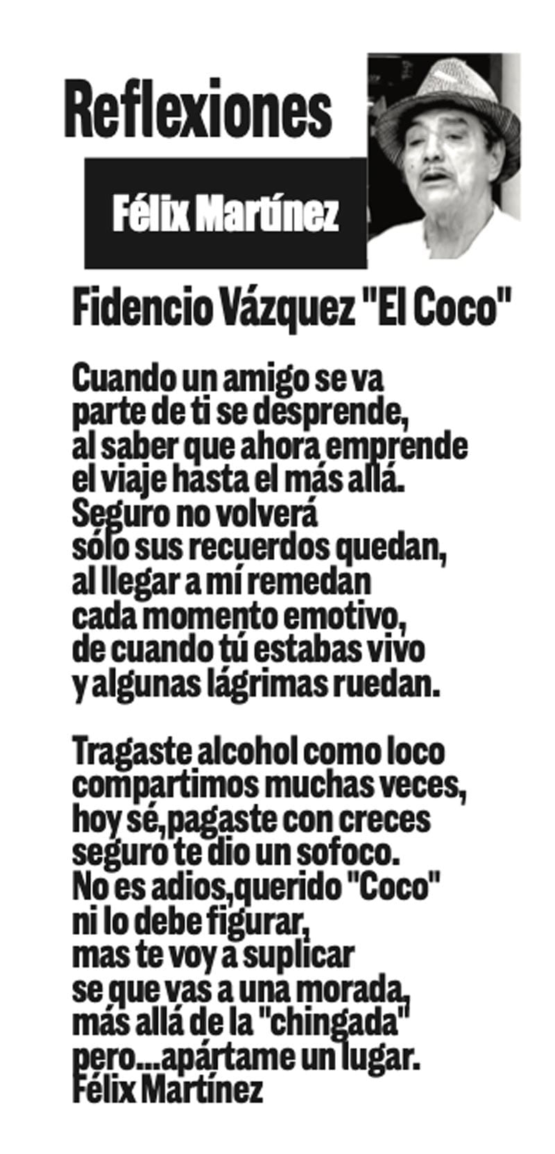 REFLEXIONES | FIDENCIO VÁZQUEZ "EI COCO" - Cuando un amigo se va parte de ti se desprende, al saber que ahora emprende el viale hasta el mas alla. Seguro no volverá sólo sus recuerdos quedan, al llegar a mí remedan cada momento...
