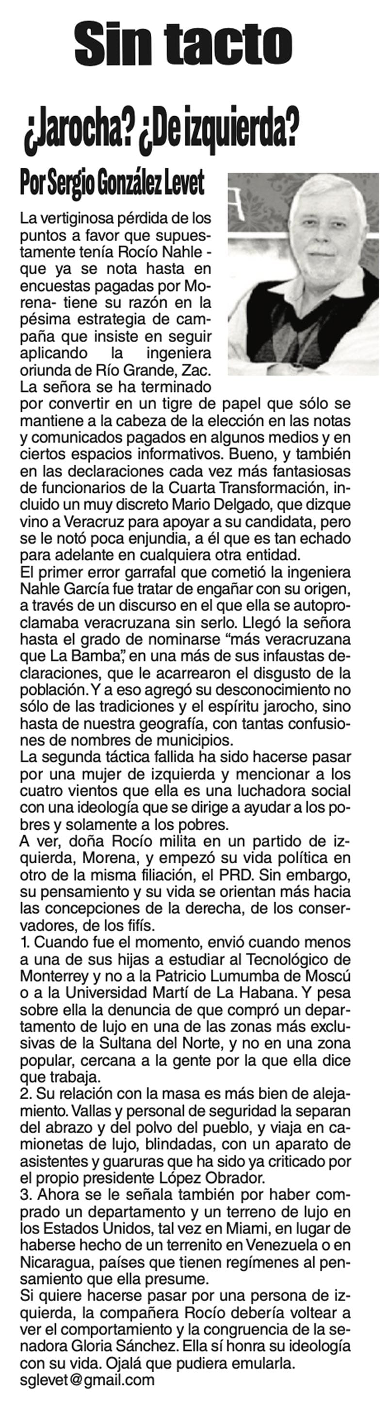 SIN TACTO | ¿JAROCHA? ¿DE IZQUIERDA? - La vertiginosa pérdida de los puntos a favor que supuestamente tenía Rocío Nahle - que ya se nota hasta en encuestas pagadas por Morena- tiene su razón...