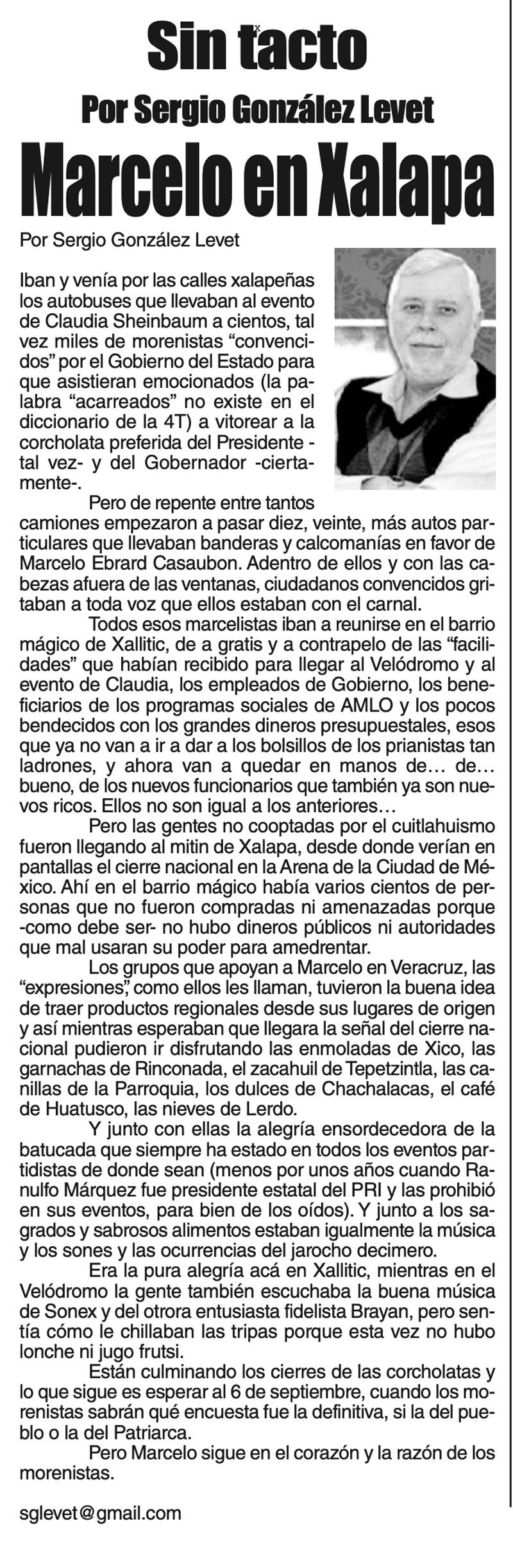 LAS COLUMNAS SIN TACTO... MARCELO EN XALAPA 28 agosto 2023 Más Noticias TEXTO IRREVERENTE | UN ARTE ETERNO - Envejecer haciendo periodismo no es sinónimo de obsolescencia ni de ser retardatario. La llamada ‘vieja guardia’ de la reporteada y del análisis periodístico... DIARIO DE UN REPORTERO | Y TODO ¿PARA QUÉ? - Tres días estuvo cerrado el centro de Xalapa porque se preparaba el escenario para el primer informe de la gobernadora Rocío Nahle. El tránsito... ACERTIJOS | NACEN LOS RIVALES EN FIFA - Es la mañana del sorteo de FIFA, en Washington, que amanece con un frio del carajo a 2 grados bajo cero y con caída de nieve. Llegan al Kennedy Center… A MIL POR HORA | - **5 películas icónicas **Seniles: bailar en casa **Marilyn y Chanel 5 **Sabroso quesito fundido... LAS COSAS COMO SON | - MAS QUE UN DIARIO... TEXTO IRREVERENTE | LE VA A 'ECHAR GANITAS' - Al parecer, el asunto es 'chimoltrufiar' o sea lo mismo decir una cosa que otra. En marzo, el gobierno estatal informó que el programa de rehabilitación de carreteras y caminos conocido como "Bachetón"... ACERTIJOS | EL QUINTO PARTIDO - En la historia de los mundiales, México nunca ha jugado el quinto partido fuera de casa. Lo más que hemos alcanzado es el cuarto juego y de allí nos mandan a casa… A MIL POR HORA | - **Un matrimonio feliz **Apocalipsis jarocho **La isla de los pedófilos **“Amor con amor se paga”... A MIL POR HORA | - **Chicas más guapas **Días revolcados **Fascinantes artistas **Academia de Ególatras... CANCIONERO | EL PAN Y EL LLORO - Nada es accidental en la política. Este fin de semana, la señora presidente con A de patria tendrá una magna concentración de sus seguidores para celebrar el aniversario...