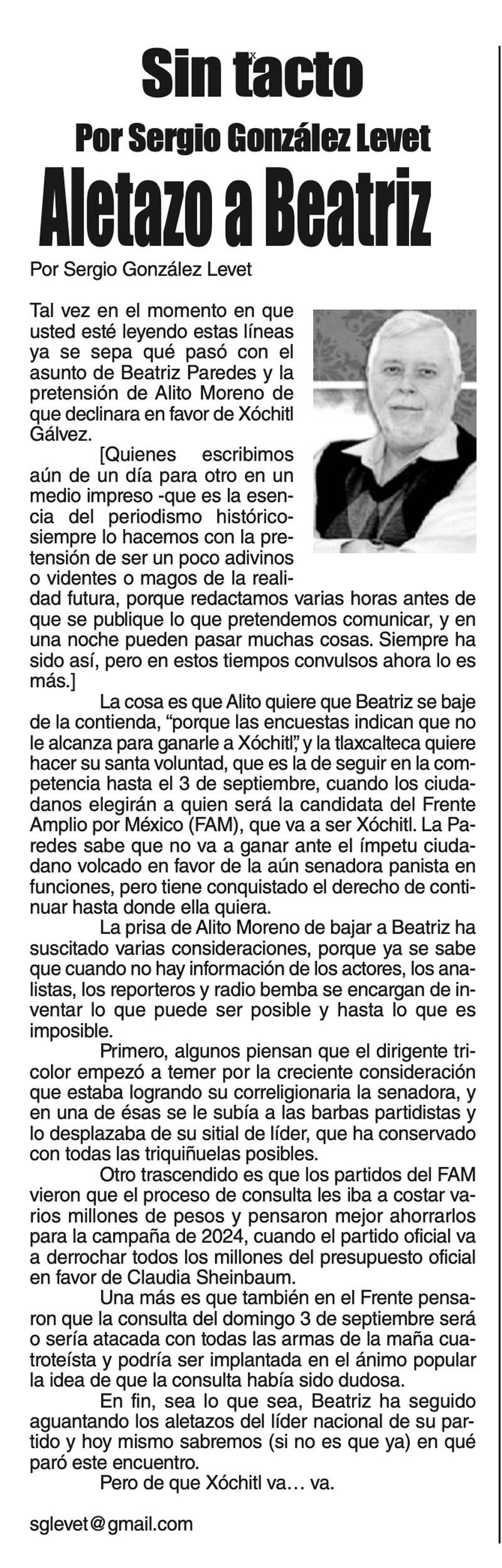 LAS COLUMNAS SIN TACTO... ALETAZO A BEATRIZ... 30 agosto 2023 Más Noticias LAS COSAS COMO SON | - MAS QUE UN DIARIO... TEXTO IRREVERENTE | LE VA A 'ECHAR GANITAS' - Al parecer, el asunto es 'chimoltrufiar' o sea lo mismo decir una cosa que otra. En marzo, el gobierno estatal informó que el programa de rehabilitación de carreteras y caminos conocido como "Bachetón"... ACERTIJOS | EL QUINTO PARTIDO - En la historia de los mundiales, México nunca ha jugado el quinto partido fuera de casa. Lo más que hemos alcanzado es el cuarto juego y de allí nos mandan a casa… A MIL POR HORA | - **Un matrimonio feliz **Apocalipsis jarocho **La isla de los pedófilos **“Amor con amor se paga”... A MIL POR HORA | - **Chicas más guapas **Días revolcados **Fascinantes artistas **Academia de Ególatras... CANCIONERO | EL PAN Y EL LLORO - Nada es accidental en la política. Este fin de semana, la señora presidente con A de patria tendrá una magna concentración de sus seguidores para celebrar el aniversario... TEXTO IRREVERENTE | ENNOCHEBUENADOS - La mercadotecnia adelanta todo y, ni modo, hay que lidiar con eso. Cuando todavía no acababa noviembre ya se vendían productos navideños y ahora mismo por doquiera se ven locales adornados con ese motivo... SIN TACTO | LAS VÍSPERAS - ¿Se acuerda la memorable lectora? ¿Recuerda el memorioso lector?: “Ya va llegando diciembre y sus posadas. Se va acercando ya también la Navidad. El año nuevo... LAS COSAS COMO SON - VAYA CINISMO... TEXTO IRREVERENTE | AÑO BUENO, AÑO MALO - El 2024 fue un año de suerte y abundancia. Este 2025 ha corrido en su contra con infortunio político y mediático. ¿‘Annus horribilis’? Tal vez no llega a tanto, pero sí desastroso y confirmatorio de sus...
