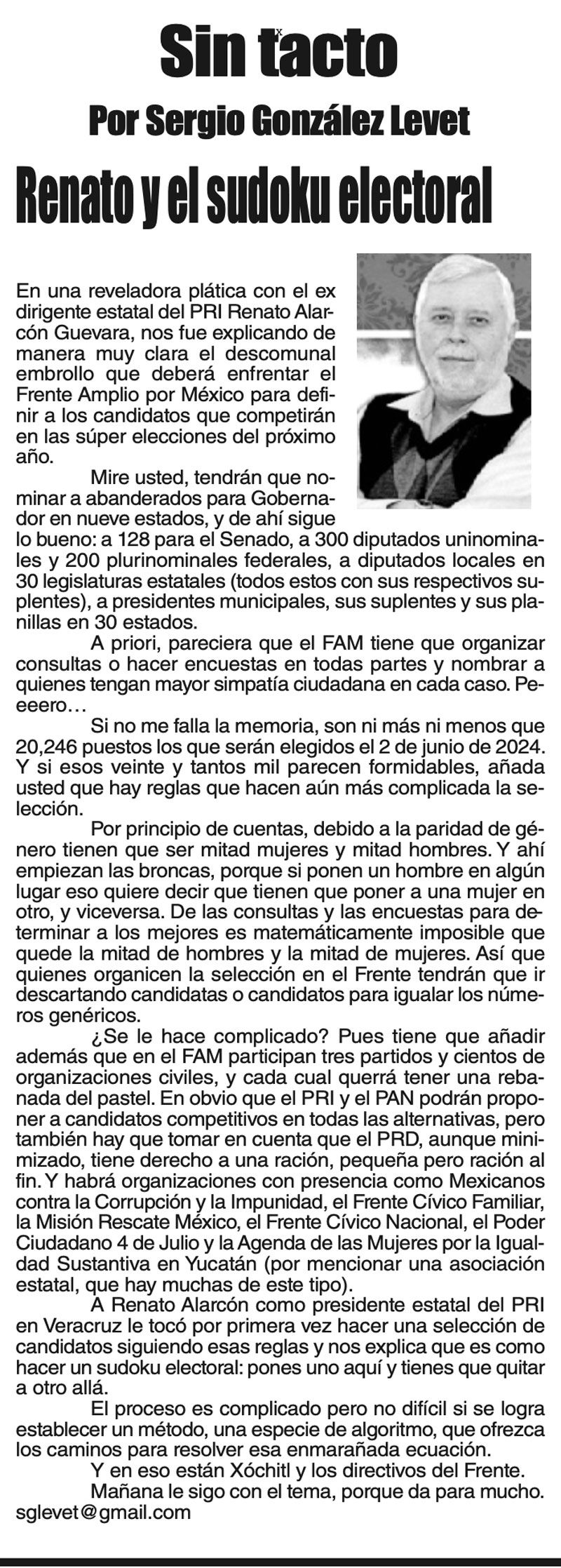 LAS COLUMNAS SIN TACTO RENATO Y EL SODOKU ELECTORAL 13 septiembre 2023 Más Noticias LAS COSAS COMO SON | - MAS QUE UN DIARIO... TEXTO IRREVERENTE | LE VA A 'ECHAR GANITAS' - Al parecer, el asunto es 'chimoltrufiar' o sea lo mismo decir una cosa que otra. En marzo, el gobierno estatal informó que el programa de rehabilitación de carreteras y caminos conocido como "Bachetón"... ACERTIJOS | EL QUINTO PARTIDO - En la historia de los mundiales, México nunca ha jugado el quinto partido fuera de casa. Lo más que hemos alcanzado es el cuarto juego y de allí nos mandan a casa… A MIL POR HORA | - **Un matrimonio feliz **Apocalipsis jarocho **La isla de los pedófilos **“Amor con amor se paga”... A MIL POR HORA | - **Chicas más guapas **Días revolcados **Fascinantes artistas **Academia de Ególatras... CANCIONERO | EL PAN Y EL LLORO - Nada es accidental en la política. Este fin de semana, la señora presidente con A de patria tendrá una magna concentración de sus seguidores para celebrar el aniversario... TEXTO IRREVERENTE | ENNOCHEBUENADOS - La mercadotecnia adelanta todo y, ni modo, hay que lidiar con eso. Cuando todavía no acababa noviembre ya se vendían productos navideños y ahora mismo por doquiera se ven locales adornados con ese motivo... SIN TACTO | LAS VÍSPERAS - ¿Se acuerda la memorable lectora? ¿Recuerda el memorioso lector?: “Ya va llegando diciembre y sus posadas. Se va acercando ya también la Navidad. El año nuevo... LAS COSAS COMO SON - VAYA CINISMO... TEXTO IRREVERENTE | AÑO BUENO, AÑO MALO - El 2024 fue un año de suerte y abundancia. Este 2025 ha corrido en su contra con infortunio político y mediático. ¿‘Annus horribilis’? Tal vez no llega a tanto, pero sí desastroso y confirmatorio de sus...