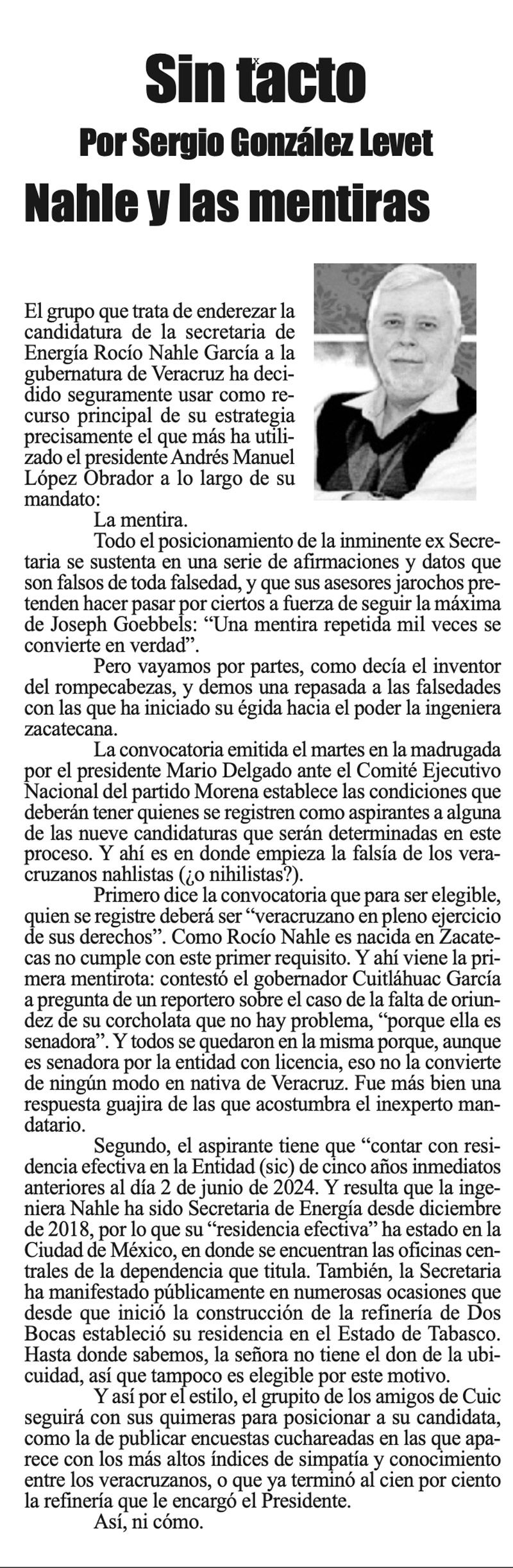 LAS COLUMNAS SIN TACTO NAHLE Y LAS MENTIRAS... 20 septiembre 2023 Más Noticias LAS COSAS COMO SON | - MAS QUE UN DIARIO... TEXTO IRREVERENTE | LE VA A 'ECHAR GANITAS' - Al parecer, el asunto es 'chimoltrufiar' o sea lo mismo decir una cosa que otra. En marzo, el gobierno estatal informó que el programa de rehabilitación de carreteras y caminos conocido como "Bachetón"... ACERTIJOS | EL QUINTO PARTIDO - En la historia de los mundiales, México nunca ha jugado el quinto partido fuera de casa. Lo más que hemos alcanzado es el cuarto juego y de allí nos mandan a casa… A MIL POR HORA | - **Un matrimonio feliz **Apocalipsis jarocho **La isla de los pedófilos **“Amor con amor se paga”... A MIL POR HORA | - **Chicas más guapas **Días revolcados **Fascinantes artistas **Academia de Ególatras... CANCIONERO | EL PAN Y EL LLORO - Nada es accidental en la política. Este fin de semana, la señora presidente con A de patria tendrá una magna concentración de sus seguidores para celebrar el aniversario... TEXTO IRREVERENTE | ENNOCHEBUENADOS - La mercadotecnia adelanta todo y, ni modo, hay que lidiar con eso. Cuando todavía no acababa noviembre ya se vendían productos navideños y ahora mismo por doquiera se ven locales adornados con ese motivo... SIN TACTO | LAS VÍSPERAS - ¿Se acuerda la memorable lectora? ¿Recuerda el memorioso lector?: “Ya va llegando diciembre y sus posadas. Se va acercando ya también la Navidad. El año nuevo... LAS COSAS COMO SON - VAYA CINISMO... TEXTO IRREVERENTE | AÑO BUENO, AÑO MALO - El 2024 fue un año de suerte y abundancia. Este 2025 ha corrido en su contra con infortunio político y mediático. ¿‘Annus horribilis’? Tal vez no llega a tanto, pero sí desastroso y confirmatorio de sus...