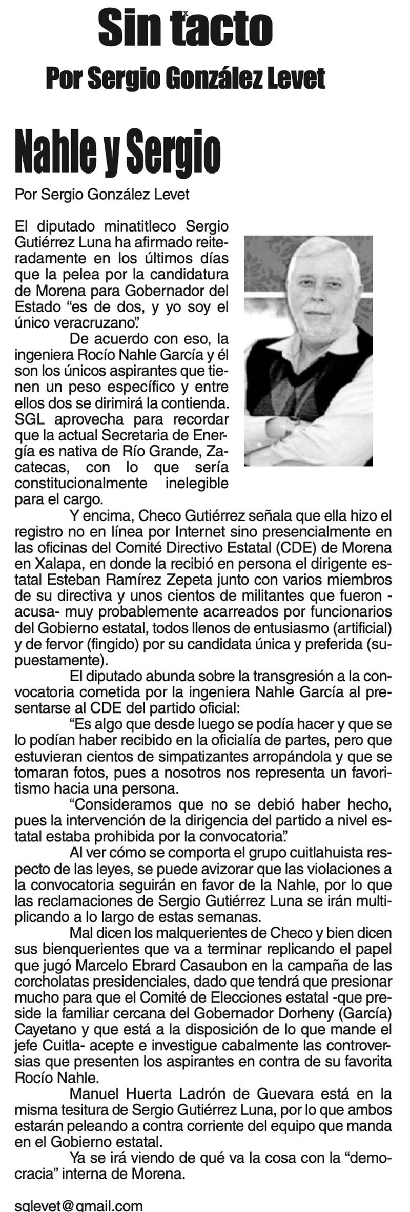 LAS COLUMNAS SIN TACTO NAHLE Y SERGIO... 27 septiembre 2023 Más Noticias CANCIONERO | PIRATAS DEL CARIBE - A la pregunta de qué va a hacer con el petróleo que llevaba el barco tanque grandote llamado Skipper y con bandera falsa de Guyana, que sus fuerzas armadas... ACERTIJOS | LOS 51 AÑOS DE NOTIVER - Allá por los años 70s nacía Notiver. Un día Guadalupano por un asunto de festejo familiar. Desde aquel día de hace 51 años, que este 12 de diciembre se cumplen, el diario... TEXTO IRREVERENTE | - Monumental, mágico, misterioso y meritorio. Así definen arqueólogos y antropólogos a El Tajín, la ciudad prehispánica que se ubica cerca de Papantla, al norte veracruzano... A MIL POR HORA | - **Los duendes existen **Honrar al IMSS **Comadrita traviesa **Javier Duarte seguirá preso... TEXTO IRREVERENTE | CINCUENTA + UNO - La familia notiveriana está velando vísperas pues mañana es su fiesta magna, la que tiene lugar cada fin de otoño, ya pisando el invierno. El cumpleaños de NOTIVER comparte fecha... CANCIONERO | EL GOZO AL POZO...DE AGUA - Muy pronto se apagó el argüende mediático armado desde Palacio Nacional, en torno a la señora presidente con A de patria, celebrando con sonrisa pareja del primer ministro de Canadá, el bailoteo al ritmo de YMCA... SIN TACTO | 4T, LAS CUENTAS ALEGRES - Bueno, cuando menos podemos aceptar que los morenos en el poder tienen una capacidad: seguir al pie de la letra las instrucciones del librito que indica cómo responder y qué decir… ACERTIJOS | POR LOS 51 DE NOTIVER - Un día antes auguraban un gran Norte, que entró en lunes. Al iniciar semana. Cotidianamente llegó con mi hermano Enrique, con Fernando Pavón, biógrafo de Tierra Blanca y el amigo... 51 Y CONTANDO… | - Medio siglo y un año, no se escribe ni fácil ni sin derramar una que otra lagrimilla: 51 años de éste su periódico NOTIVER. La Noticia en el momento que sucede, es un acontecimiento más... A MIL POR HORA | - **Migrante exitoso **Genio universal **Manipulador de mujeres **Ley vs vapeadores...