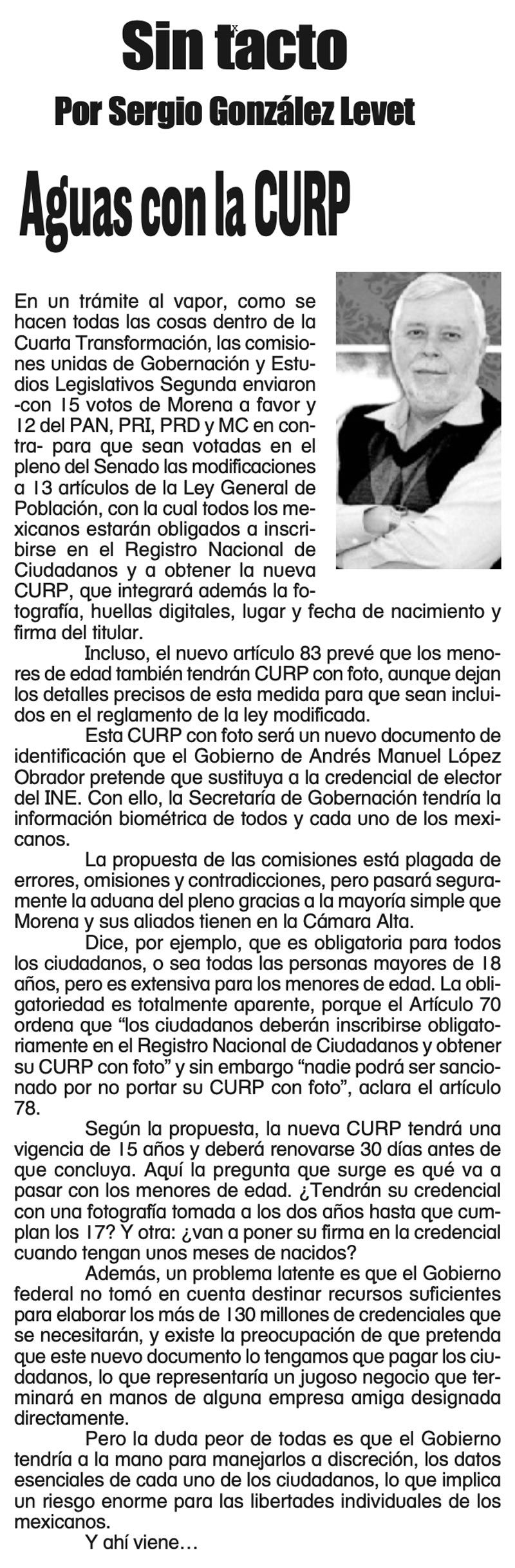 LAS COLUMNAS SIN TACTO AGUAS CON LA CURP... 28 septiembre 2023 Más Noticias TURISMÓLOGO | IMPULSAN ECONOMÍA TURÍSTICA - Importante el brindar siempre "Calidad Total en el Servicio al Cliente" siendo igual para al que consume poco, como al que mucho...! Contar con un rostro siempre… TRASTIENDA | MANDARINAZO - Trascendió que existe una escasez de mandarina en la zona norte de Veracruz luego de las recientes lluvias, los municipios más afectados son Álamo Temapache y Poza Rica, la escasez ha provocado... A MIL POR HORA | - **Personas tóxicas **Amigos de seniles **Venus de migrantes **Festival Mundial de Cine... TEXTO IRREVERENTE | UN ARTE ETERNO - Envejecer haciendo periodismo no es sinónimo de obsolescencia ni de ser retardatario. La llamada ‘vieja guardia’ de la reporteada y del análisis periodístico... DIARIO DE UN REPORTERO | Y TODO ¿PARA QUÉ? - Tres días estuvo cerrado el centro de Xalapa porque se preparaba el escenario para el primer informe de la gobernadora Rocío Nahle. El tránsito... ACERTIJOS | NACEN LOS RIVALES EN FIFA - Es la mañana del sorteo de FIFA, en Washington, que amanece con un frio del carajo a 2 grados bajo cero y con caída de nieve. Llegan al Kennedy Center… A MIL POR HORA | - **5 películas icónicas **Seniles: bailar en casa **Marilyn y Chanel 5 **Sabroso quesito fundido... LAS COSAS COMO SON | - MAS QUE UN DIARIO... TEXTO IRREVERENTE | LE VA A 'ECHAR GANITAS' - Al parecer, el asunto es 'chimoltrufiar' o sea lo mismo decir una cosa que otra. En marzo, el gobierno estatal informó que el programa de rehabilitación de carreteras y caminos conocido como "Bachetón"... ACERTIJOS | EL QUINTO PARTIDO - En la historia de los mundiales, México nunca ha jugado el quinto partido fuera de casa. Lo más que hemos alcanzado es el cuarto juego y de allí nos mandan a casa…