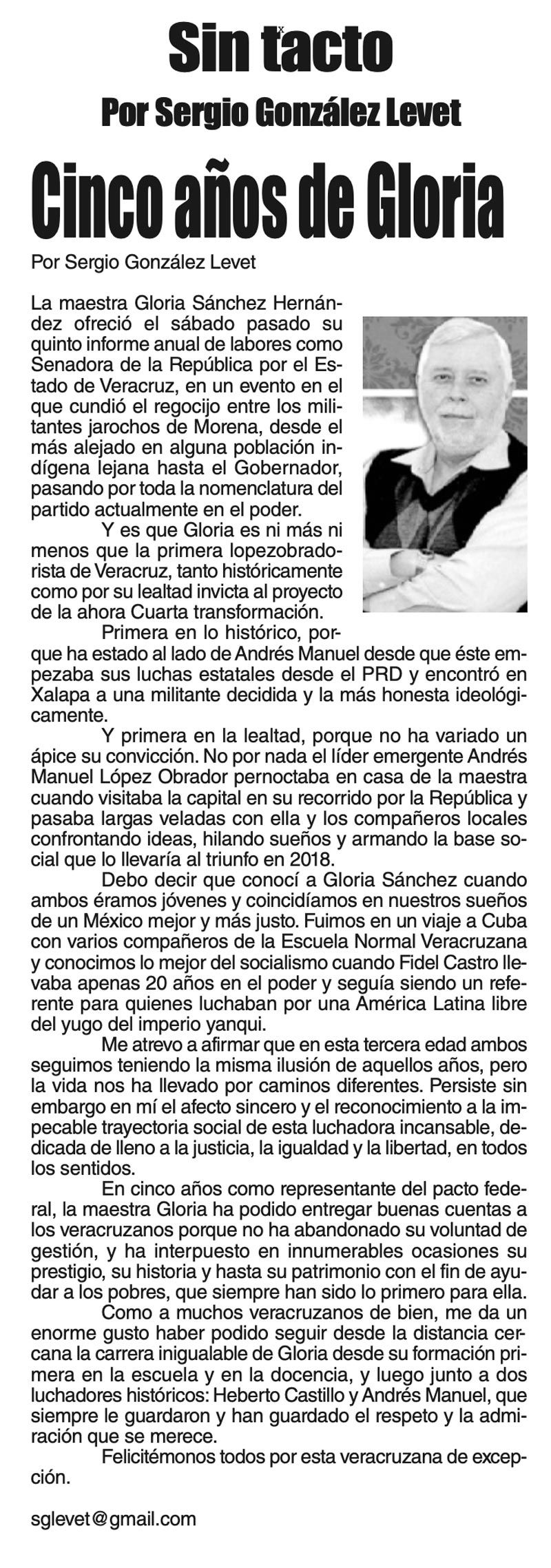 LAS COLUMNAS SIN TACTO -Cinco Años de Gloria CINCO AÑOS DE GLORIA... 9 octubre 2023 Más Noticias A MIL POR HORA | - **Chicas más guapas **Días revolcados **Fascinantes artistas **Academia de Ególatras... CANCIONERO | EL PAN Y EL LLORO - Nada es accidental en la política. Este fin de semana, la señora presidente con A de patria tendrá una magna concentración de sus seguidores para celebrar el aniversario... TEXTO IRREVERENTE | ENNOCHEBUENADOS - La mercadotecnia adelanta todo y, ni modo, hay que lidiar con eso. Cuando todavía no acababa noviembre ya se vendían productos navideños y ahora mismo por doquiera se ven locales adornados con ese motivo... SIN TACTO | LAS VÍSPERAS - ¿Se acuerda la memorable lectora? ¿Recuerda el memorioso lector?: “Ya va llegando diciembre y sus posadas. Se va acercando ya también la Navidad. El año nuevo... LAS COSAS COMO SON - VAYA CINISMO... TEXTO IRREVERENTE | AÑO BUENO, AÑO MALO - El 2024 fue un año de suerte y abundancia. Este 2025 ha corrido en su contra con infortunio político y mediático. ¿‘Annus horribilis’? Tal vez no llega a tanto, pero sí desastroso y confirmatorio de sus... SIN TACTO | ¿PORRAS A NOROÑA? - El cada vez más impresentable y alocado Gerardo Fernández Noroña le hizo el dudoso honor y el muy flaco favor a la gobernadora Rocío Nahle… ACERTIJOS | - Decía un gran columnista, que aunque fuera día de celebración o de cumple o de lo que sea, nunca hay que dejar de teclear algo, para seguir activos. Hoy es mi cumple... CANCIONERO | EL FISCAL INCÓMODO - Nadie pudo imaginar que un incidente en el concurso de Miss Universo, esa feria machista de la carne y la lascivia, disfrazada del más pueril nacionalismo, fuera a… A MIL POR HORA | - **Un día feliz **Amores prohibidos **$350 mil de recompensas **La política más joven...