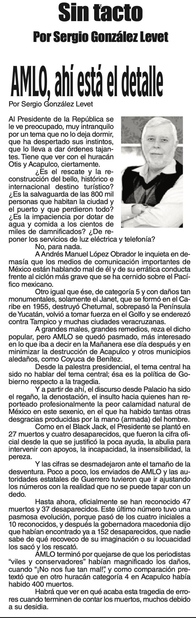 LAS COLUMNAS SIN TACTO -AMLO, AHÍ ESTÁ EL DETALLE AMLO, AHÍ ESTÁ EL DETALLE... 31 octubre 2023 Más Noticias LAS COSAS COMO SON | - MAS QUE UN DIARIO... TEXTO IRREVERENTE | LE VA A 'ECHAR GANITAS' - Al parecer, el asunto es 'chimoltrufiar' o sea lo mismo decir una cosa que otra. En marzo, el gobierno estatal informó que el programa de rehabilitación de carreteras y caminos conocido como "Bachetón"... ACERTIJOS | EL QUINTO PARTIDO - En la historia de los mundiales, México nunca ha jugado el quinto partido fuera de casa. Lo más que hemos alcanzado es el cuarto juego y de allí nos mandan a casa… A MIL POR HORA | - **Un matrimonio feliz **Apocalipsis jarocho **La isla de los pedófilos **“Amor con amor se paga”... A MIL POR HORA | - **Chicas más guapas **Días revolcados **Fascinantes artistas **Academia de Ególatras... CANCIONERO | EL PAN Y EL LLORO - Nada es accidental en la política. Este fin de semana, la señora presidente con A de patria tendrá una magna concentración de sus seguidores para celebrar el aniversario... TEXTO IRREVERENTE | ENNOCHEBUENADOS - La mercadotecnia adelanta todo y, ni modo, hay que lidiar con eso. Cuando todavía no acababa noviembre ya se vendían productos navideños y ahora mismo por doquiera se ven locales adornados con ese motivo... SIN TACTO | LAS VÍSPERAS - ¿Se acuerda la memorable lectora? ¿Recuerda el memorioso lector?: “Ya va llegando diciembre y sus posadas. Se va acercando ya también la Navidad. El año nuevo... LAS COSAS COMO SON - VAYA CINISMO... TEXTO IRREVERENTE | AÑO BUENO, AÑO MALO - El 2024 fue un año de suerte y abundancia. Este 2025 ha corrido en su contra con infortunio político y mediático. ¿‘Annus horribilis’? Tal vez no llega a tanto, pero sí desastroso y confirmatorio de sus...