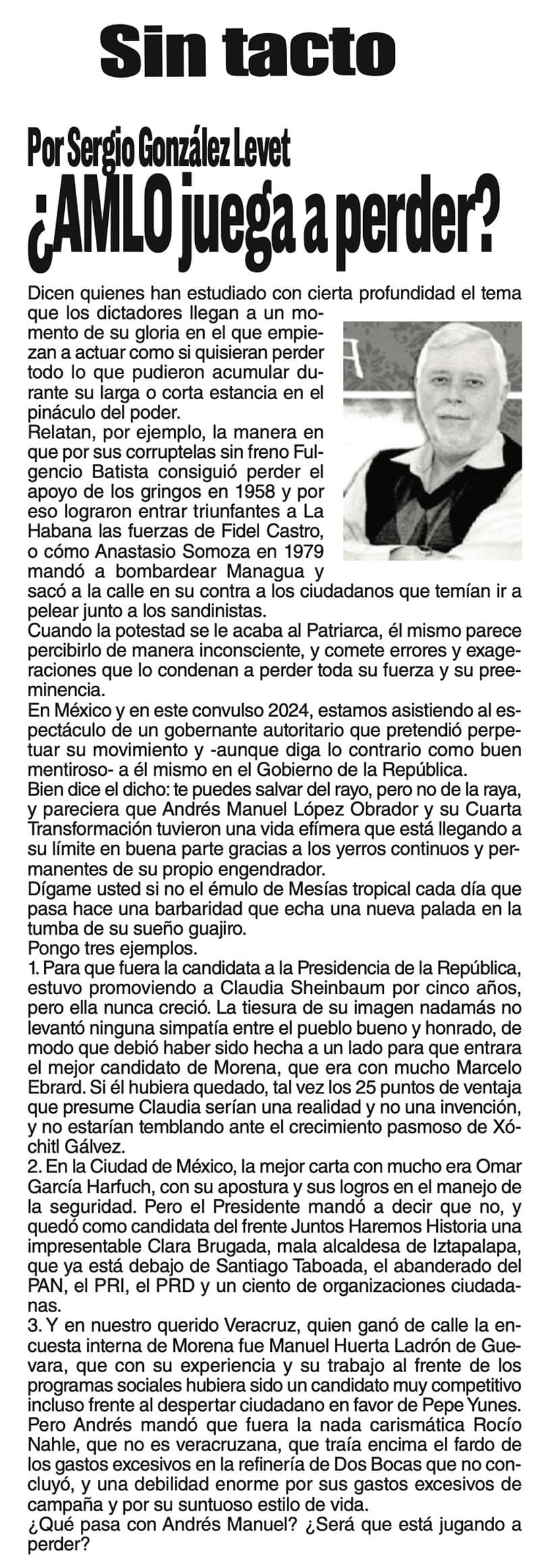 SIN TACTO | ¿AMLO JUEGA A PERDER? - Dicen quienes han estudiado con cierta profundidad el tema que los dictadores llegan a un momento de su gloria en el que empiezan a actuar...