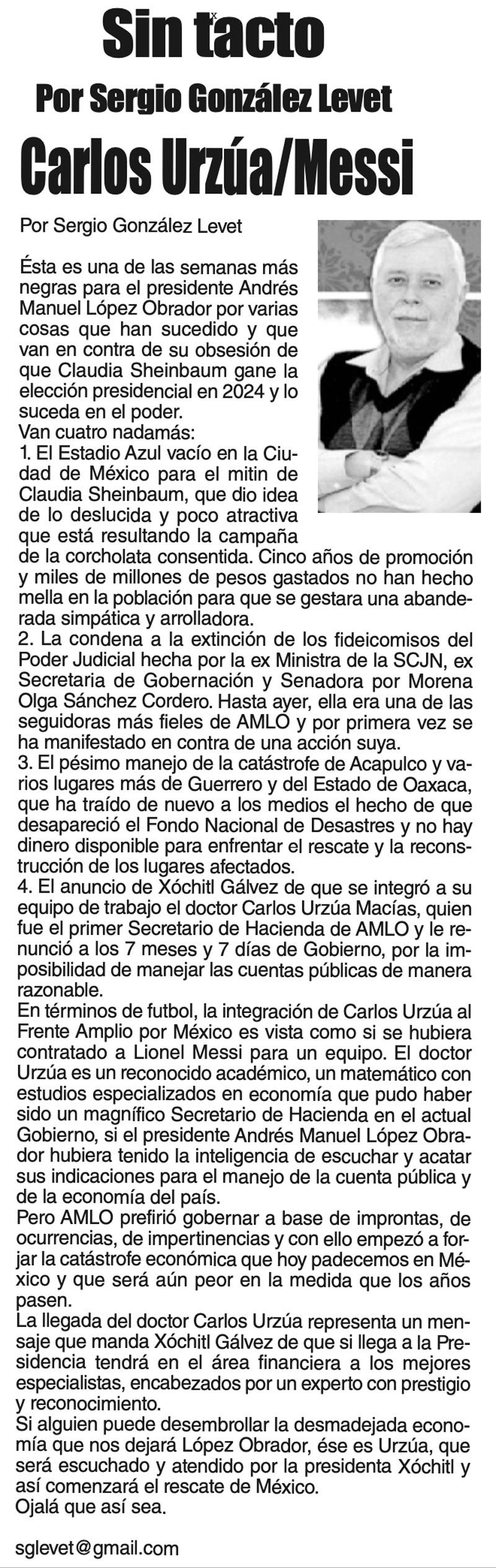 LAS COLUMNAS SIN TACTO -CARLOS URZÚA/MESSI CARLOS URZÚA/MESSI... 26 octubre 2023 Más Noticias LAS COSAS COMO SON | - MAS QUE UN DIARIO... TEXTO IRREVERENTE | LE VA A 'ECHAR GANITAS' - Al parecer, el asunto es 'chimoltrufiar' o sea lo mismo decir una cosa que otra. En marzo, el gobierno estatal informó que el programa de rehabilitación de carreteras y caminos conocido como "Bachetón"... ACERTIJOS | EL QUINTO PARTIDO - En la historia de los mundiales, México nunca ha jugado el quinto partido fuera de casa. Lo más que hemos alcanzado es el cuarto juego y de allí nos mandan a casa… A MIL POR HORA | - **Un matrimonio feliz **Apocalipsis jarocho **La isla de los pedófilos **“Amor con amor se paga”... A MIL POR HORA | - **Chicas más guapas **Días revolcados **Fascinantes artistas **Academia de Ególatras... CANCIONERO | EL PAN Y EL LLORO - Nada es accidental en la política. Este fin de semana, la señora presidente con A de patria tendrá una magna concentración de sus seguidores para celebrar el aniversario... TEXTO IRREVERENTE | ENNOCHEBUENADOS - La mercadotecnia adelanta todo y, ni modo, hay que lidiar con eso. Cuando todavía no acababa noviembre ya se vendían productos navideños y ahora mismo por doquiera se ven locales adornados con ese motivo... SIN TACTO | LAS VÍSPERAS - ¿Se acuerda la memorable lectora? ¿Recuerda el memorioso lector?: “Ya va llegando diciembre y sus posadas. Se va acercando ya también la Navidad. El año nuevo... LAS COSAS COMO SON - VAYA CINISMO... TEXTO IRREVERENTE | AÑO BUENO, AÑO MALO - El 2024 fue un año de suerte y abundancia. Este 2025 ha corrido en su contra con infortunio político y mediático. ¿‘Annus horribilis’? Tal vez no llega a tanto, pero sí desastroso y confirmatorio de sus...