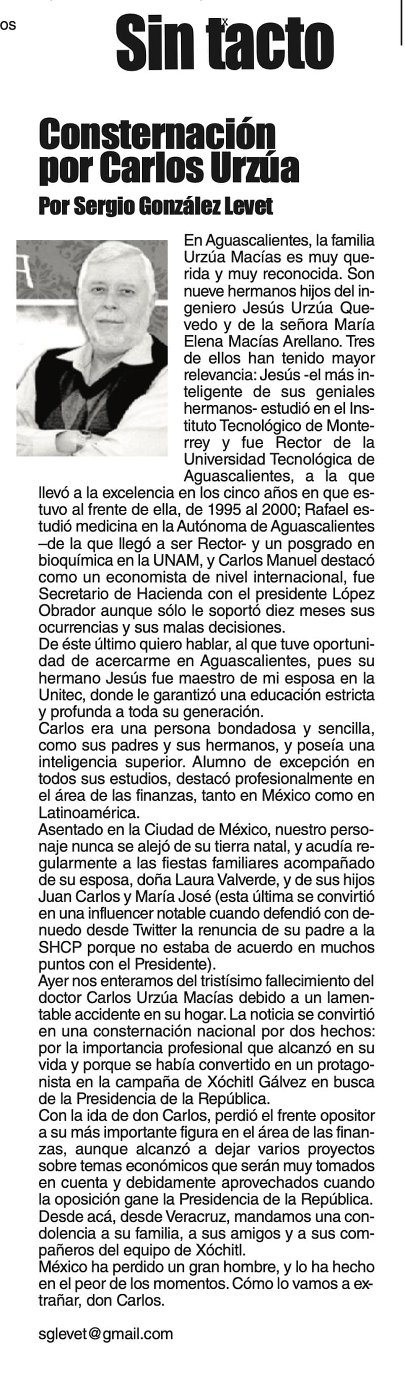 LAS COLUMNAS SIN TACTO | CONSTERNACIÓN POR CARLOS URZÚA - En Aguascalientes, la Familia Urzúa Macías es Muy Querida y Muy Reconocida... CONSTERNACIÓN POR CARLOS URZÚA... 20 febrero 2024 Más Noticias LAS COSAS COMO SON | - MAS QUE UN DIARIO... TEXTO IRREVERENTE | LE VA A 'ECHAR GANITAS' - Al parecer, el asunto es 'chimoltrufiar' o sea lo mismo decir una cosa que otra. En marzo, el gobierno estatal informó que el programa de rehabilitación de carreteras y caminos conocido como "Bachetón"... ACERTIJOS | EL QUINTO PARTIDO - En la historia de los mundiales, México nunca ha jugado el quinto partido fuera de casa. Lo más que hemos alcanzado es el cuarto juego y de allí nos mandan a casa… A MIL POR HORA | - **Un matrimonio feliz **Apocalipsis jarocho **La isla de los pedófilos **“Amor con amor se paga”... A MIL POR HORA | - **Chicas más guapas **Días revolcados **Fascinantes artistas **Academia de Ególatras... CANCIONERO | EL PAN Y EL LLORO - Nada es accidental en la política. Este fin de semana, la señora presidente con A de patria tendrá una magna concentración de sus seguidores para celebrar el aniversario... TEXTO IRREVERENTE | ENNOCHEBUENADOS - La mercadotecnia adelanta todo y, ni modo, hay que lidiar con eso. Cuando todavía no acababa noviembre ya se vendían productos navideños y ahora mismo por doquiera se ven locales adornados con ese motivo... SIN TACTO | LAS VÍSPERAS - ¿Se acuerda la memorable lectora? ¿Recuerda el memorioso lector?: “Ya va llegando diciembre y sus posadas. Se va acercando ya también la Navidad. El año nuevo... LAS COSAS COMO SON - VAYA CINISMO... TEXTO IRREVERENTE | AÑO BUENO, AÑO MALO - El 2024 fue un año de suerte y abundancia. Este 2025 ha corrido en su contra con infortunio político y mediático. ¿‘Annus horribilis’? Tal vez no llega a tanto, pero sí desastroso y confirmatorio de sus...