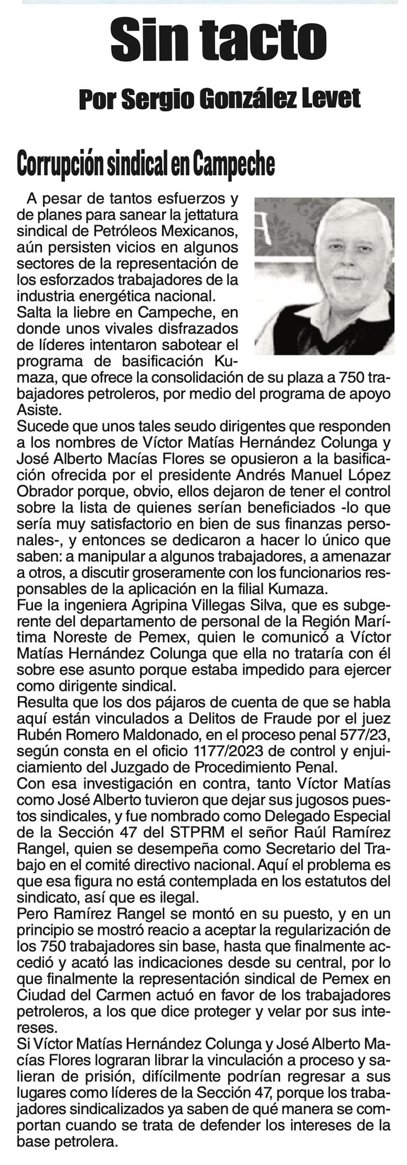 SIN TACTO | CORRUPCIÓN SINDICAL EN CAMPECHE - A pesar de tantos esfuerzos y de planes para sanear la jettatura sindical de Petróleos Mexicanos, aún persisten vicios en algunos sectores de la representación...