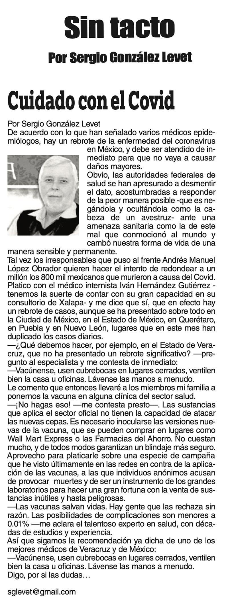 SIN TACTO | CUIDADO CON EL COVID - De acuerdo con lo que han señalado varios médicos epide-miólogos, hay un rebrote de la enfermedad del coronavirus en México, y debe ser atendido de inmediato para que no vaya a causar daños...