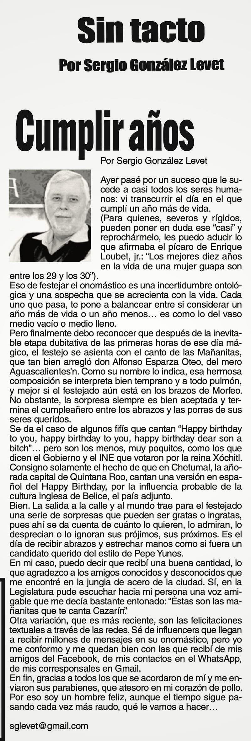 SIN TACTO | CUMPLIR AÑOS - Ayer pasé por un suceso que le sucede a casi todos los seres humanos: vi transcurrir el día en el que cumplí un año más de vida. (Para quienes, severos y rígidos, pueden poner en duda...