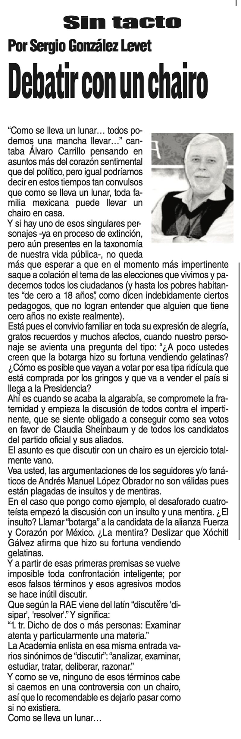 SIN TACTO | DEBATIR CON UN CHAIRO - “Como se lleva un lunar… todos podemos una mancha llevar…” cantaba Álvaro Carrillo pensando en asuntos más del corazón sentimental que del político...