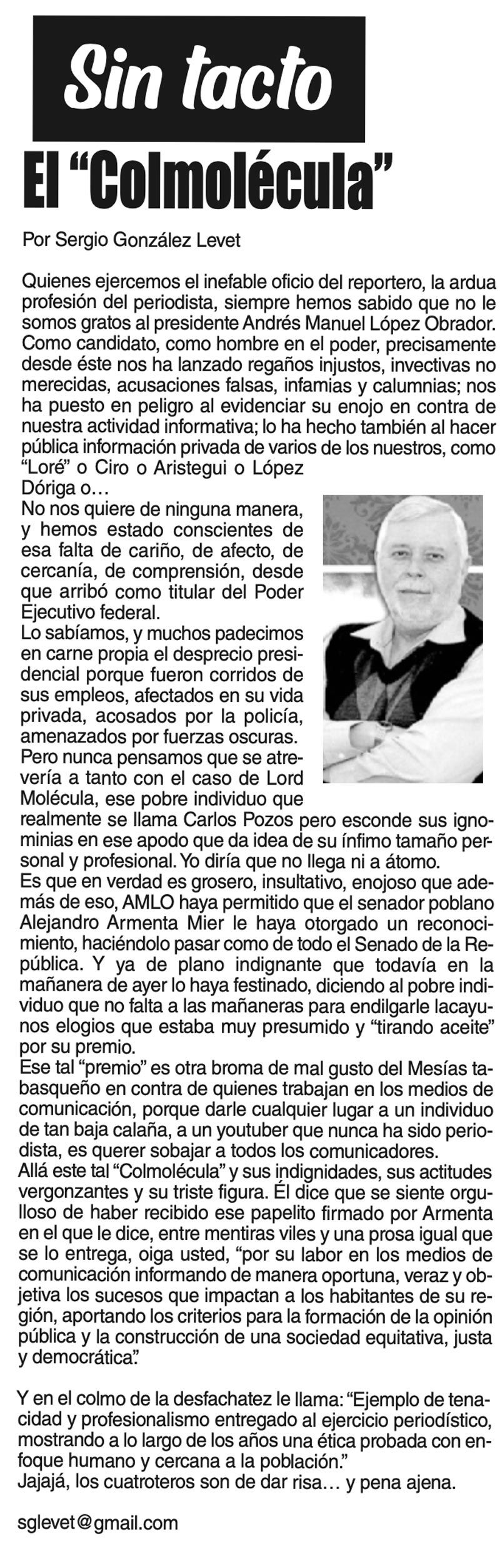 LAS COLUMNAS SIN TACTO -EL ❝COLMOLÉCULA ❞ EL ❝COLMOLÉCULA ❞... 19 octubre 2023 Más Noticias CANCIONERO | PIRATAS DEL CARIBE - A la pregunta de qué va a hacer con el petróleo que llevaba el barco tanque grandote llamado Skipper y con bandera falsa de Guyana, que sus fuerzas armadas... ACERTIJOS | LOS 51 AÑOS DE NOTIVER - Allá por los años 70s nacía Notiver. Un día Guadalupano por un asunto de festejo familiar. Desde aquel día de hace 51 años, que este 12 de diciembre se cumplen, el diario... TEXTO IRREVERENTE | - Monumental, mágico, misterioso y meritorio. Así definen arqueólogos y antropólogos a El Tajín, la ciudad prehispánica que se ubica cerca de Papantla, al norte veracruzano... A MIL POR HORA | - **Los duendes existen **Honrar al IMSS **Comadrita traviesa **Javier Duarte seguirá preso... TEXTO IRREVERENTE | CINCUENTA + UNO - La familia notiveriana está velando vísperas pues mañana es su fiesta magna, la que tiene lugar cada fin de otoño, ya pisando el invierno. El cumpleaños de NOTIVER comparte fecha... CANCIONERO | EL GOZO AL POZO...DE AGUA - Muy pronto se apagó el argüende mediático armado desde Palacio Nacional, en torno a la señora presidente con A de patria, celebrando con sonrisa pareja del primer ministro de Canadá, el bailoteo al ritmo de YMCA... SIN TACTO | 4T, LAS CUENTAS ALEGRES - Bueno, cuando menos podemos aceptar que los morenos en el poder tienen una capacidad: seguir al pie de la letra las instrucciones del librito que indica cómo responder y qué decir… ACERTIJOS | POR LOS 51 DE NOTIVER - Un día antes auguraban un gran Norte, que entró en lunes. Al iniciar semana. Cotidianamente llegó con mi hermano Enrique, con Fernando Pavón, biógrafo de Tierra Blanca y el amigo... 51 Y CONTANDO… | - Medio siglo y un año, no se escribe ni fácil ni sin derramar una que otra lagrimilla: 51 años de éste su periódico NOTIVER. La Noticia en el momento que sucede, es un acontecimiento más... A MIL POR HORA | - **Migrante exitoso **Genio universal **Manipulador de mujeres **Ley vs vapeadores...