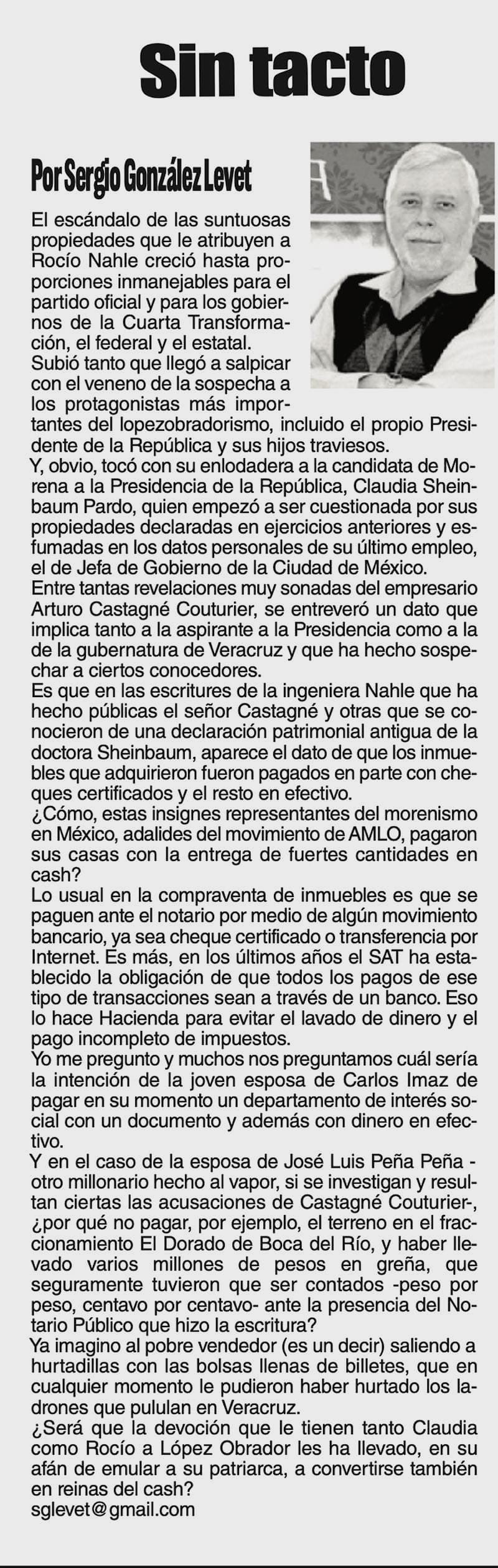 SIN TACTO | - El escándalo de las suntuosas propiedades que le atribuyen a Rocío Nahle creció hasta proporciones inmanejables para el partido oficial y para los gobiernos...