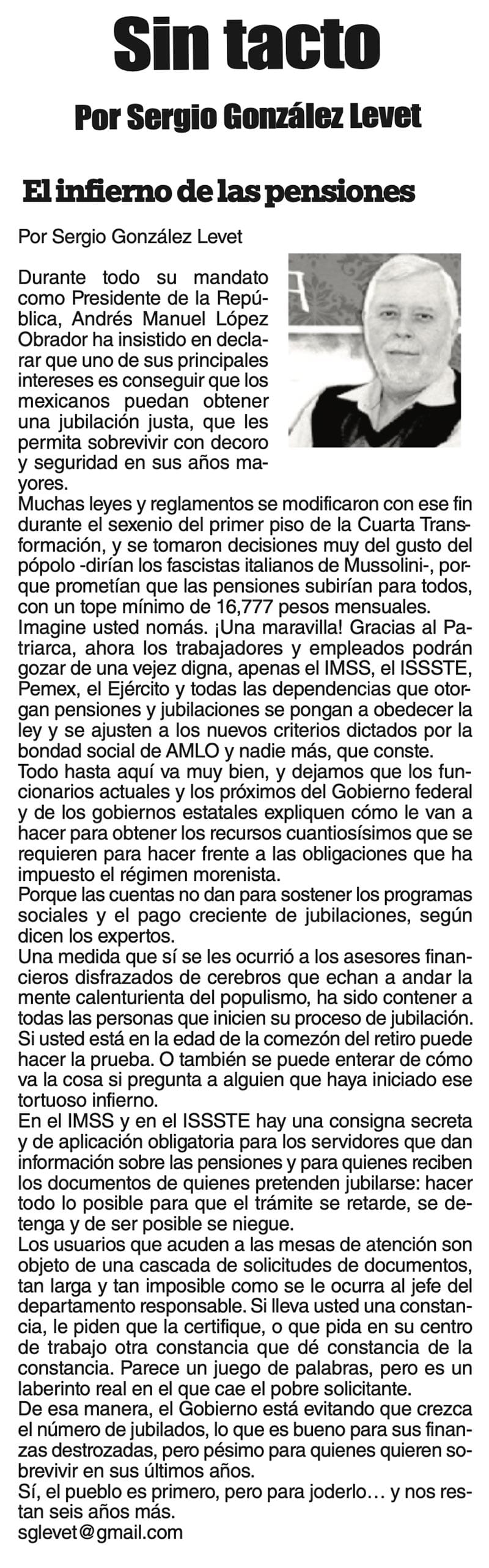 SIN TACTO | EL INFIERNO DE LAS PENSIONES - Durante todo su mandato como Presidente de la República, Andrés Manuel López Obrador ha insistido en declarar que uno de sus principales intereses es conseguir que los mexicanos...