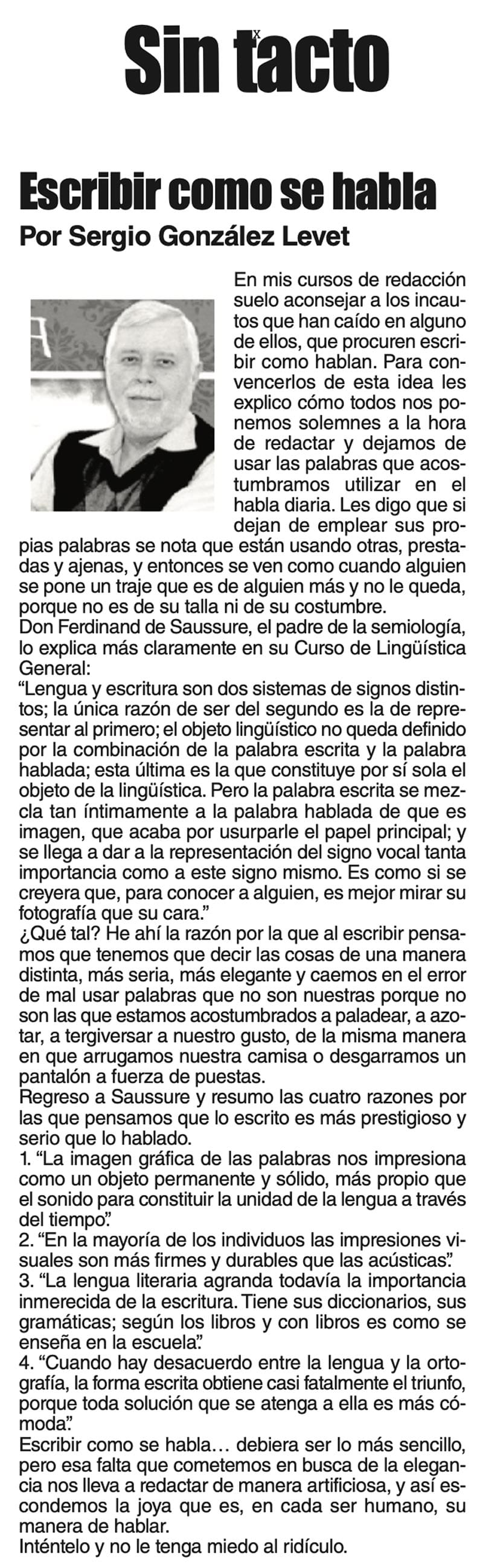 LAS COLUMNAS SIN TACTO | ESCRIBIR COMO SE HABLA - En mis cursos de redacción suelo aconsejar a los incautos que han caído en alguno de ellos, que procuren escribir como hablan... ESCRIBIR COMO SE HABLA... 22 febrero 2024 Más Noticias A MIL POR HORA | - **Chicas más guapas **Días revolcados **Fascinantes artistas **Academia de Ególatras... CANCIONERO | EL PAN Y EL LLORO - Nada es accidental en la política. Este fin de semana, la señora presidente con A de patria tendrá una magna concentración de sus seguidores para celebrar el aniversario... TEXTO IRREVERENTE | ENNOCHEBUENADOS - La mercadotecnia adelanta todo y, ni modo, hay que lidiar con eso. Cuando todavía no acababa noviembre ya se vendían productos navideños y ahora mismo por doquiera se ven locales adornados con ese motivo... SIN TACTO | LAS VÍSPERAS - ¿Se acuerda la memorable lectora? ¿Recuerda el memorioso lector?: “Ya va llegando diciembre y sus posadas. Se va acercando ya también la Navidad. El año nuevo... LAS COSAS COMO SON - VAYA CINISMO... TEXTO IRREVERENTE | AÑO BUENO, AÑO MALO - El 2024 fue un año de suerte y abundancia. Este 2025 ha corrido en su contra con infortunio político y mediático. ¿‘Annus horribilis’? Tal vez no llega a tanto, pero sí desastroso y confirmatorio de sus... SIN TACTO | ¿PORRAS A NOROÑA? - El cada vez más impresentable y alocado Gerardo Fernández Noroña le hizo el dudoso honor y el muy flaco favor a la gobernadora Rocío Nahle… ACERTIJOS | - Decía un gran columnista, que aunque fuera día de celebración o de cumple o de lo que sea, nunca hay que dejar de teclear algo, para seguir activos. Hoy es mi cumple... CANCIONERO | EL FISCAL INCÓMODO - Nadie pudo imaginar que un incidente en el concurso de Miss Universo, esa feria machista de la carne y la lascivia, disfrazada del más pueril nacionalismo, fuera a… A MIL POR HORA | - **Un día feliz **Amores prohibidos **$350 mil de recompensas **La política más joven...