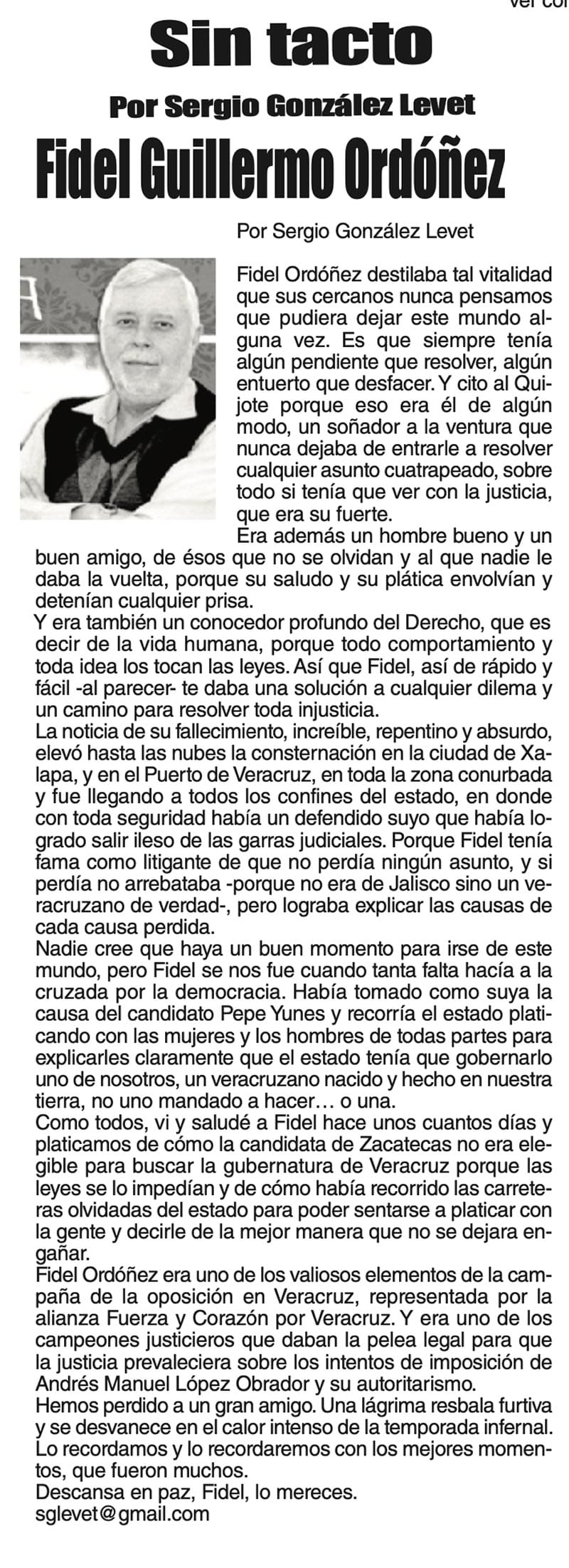 SIN TACTO | FIDEL GUILLERMO ORDÓÑEZ - Fidel Ordóñez destilaba tal vitalidad que sus cercanos nunca pensamos que pudiera dejar este mundo alguna vez. Es que siempre tenía algún pendiente...