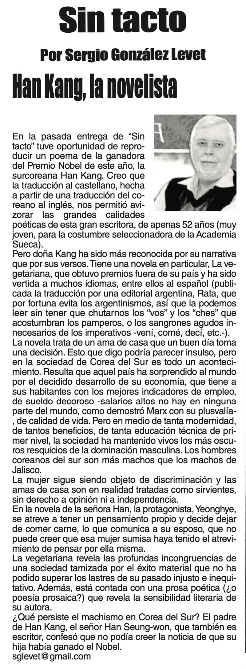 SIN TACTO | HAN KANG, LA NOVELISTA - En la pasada entrega de "Sin tacto" tuve oportunidad de reproducir un poema de la ganadora del Premio Nobel de este año, la surcoreana Han Kang. Creo que la traducción...