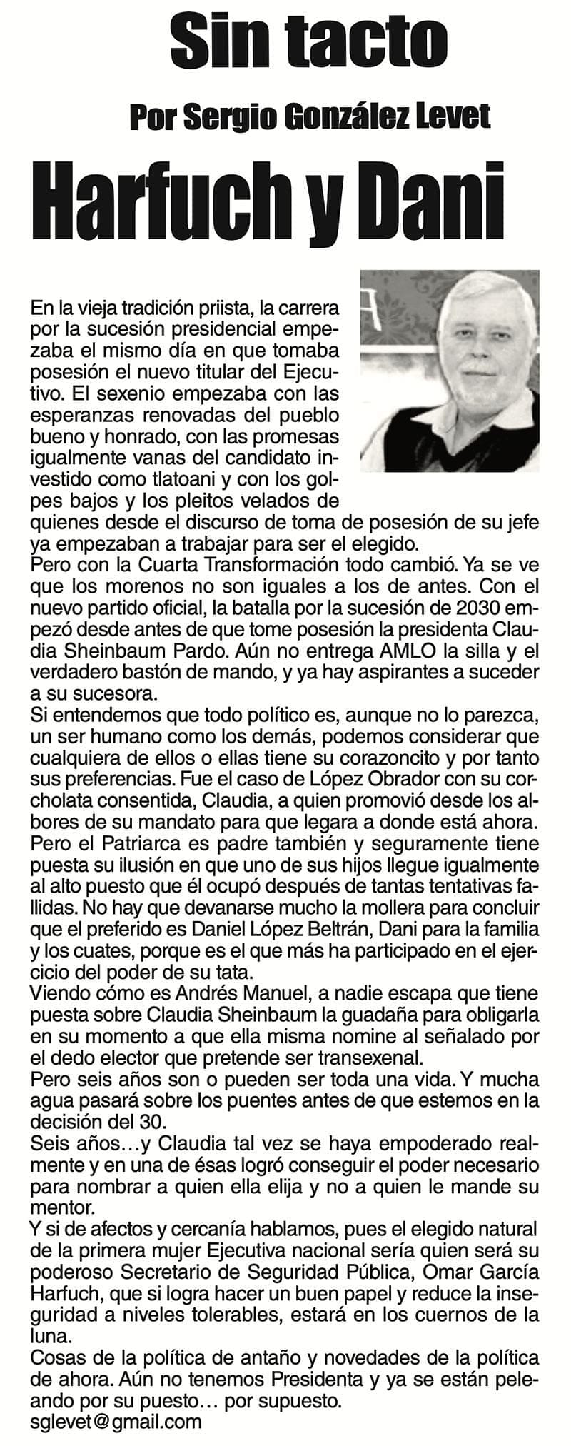 SIN TACTO | HARFUCH Y DANI - En la vieja tradición priista, la carrera por la sucesión presidencial empezaba el mismo día en que tomaba posesión el nuevo titular del Ejecutivo. El sexenio empezaba con las esperanzas renovadas...