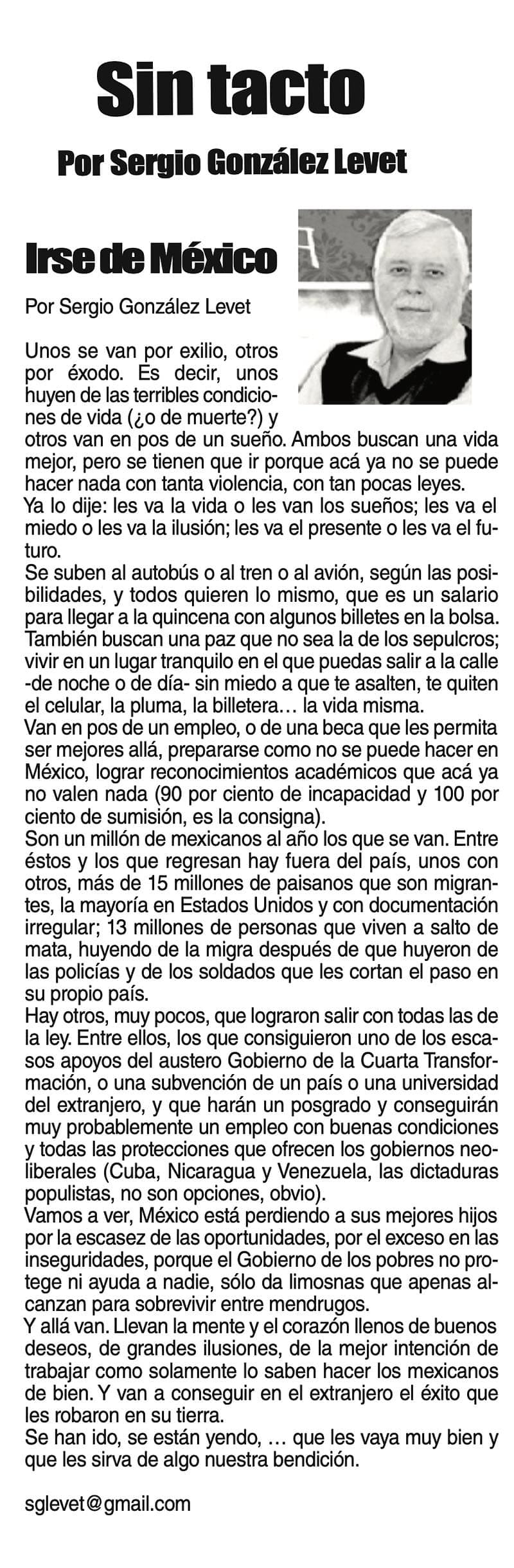 SIN TACTO | IRSE DE MÉXICO - Unos se van por exilio, otros por éxodo. Es decir, unos huyen de las terribles condiciones de vida (¿o de muerte?) y otros van en pos de un sueño. Ambos buscan una vida mejor...