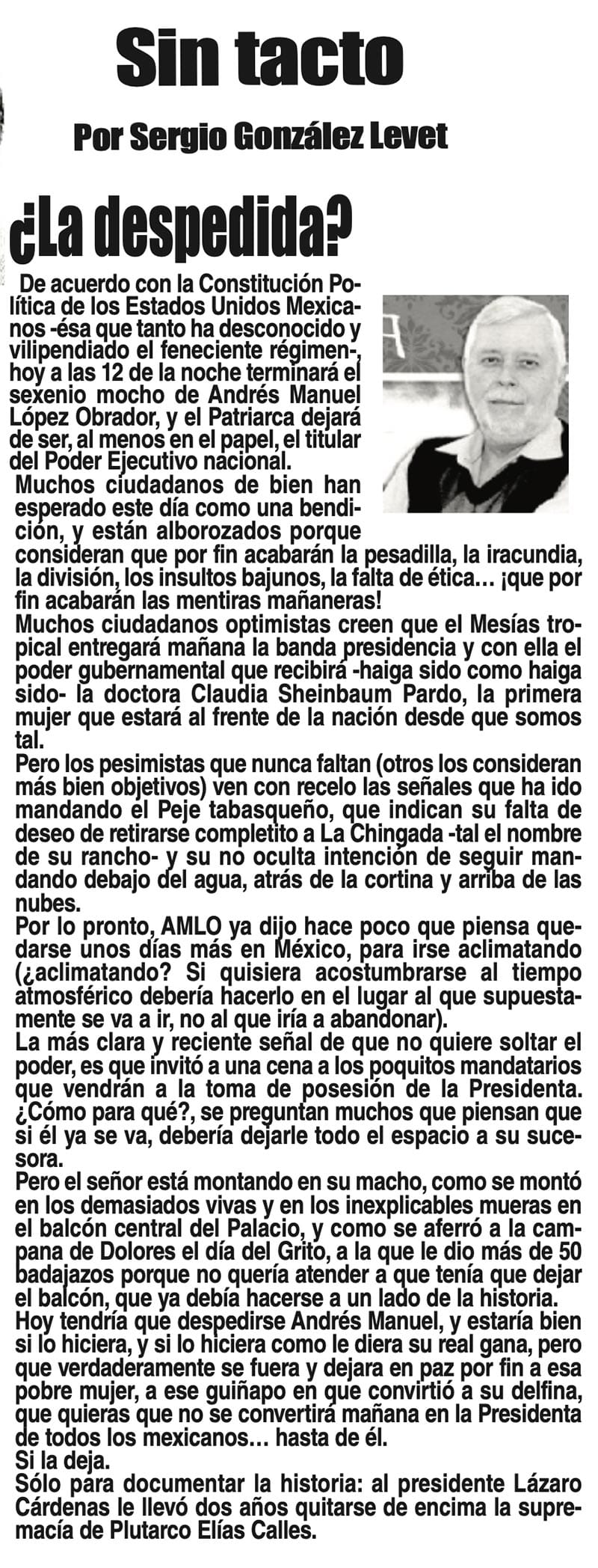 SIN TACTO | ¿LA DESPEDIDA? - De acuerdo con la Constitución Política de los Estados Unidos Mexicanos -esa que tanto ha desconocido y vilipendiado el feneciente régimen- hoy a las 12 de la noche terminará...