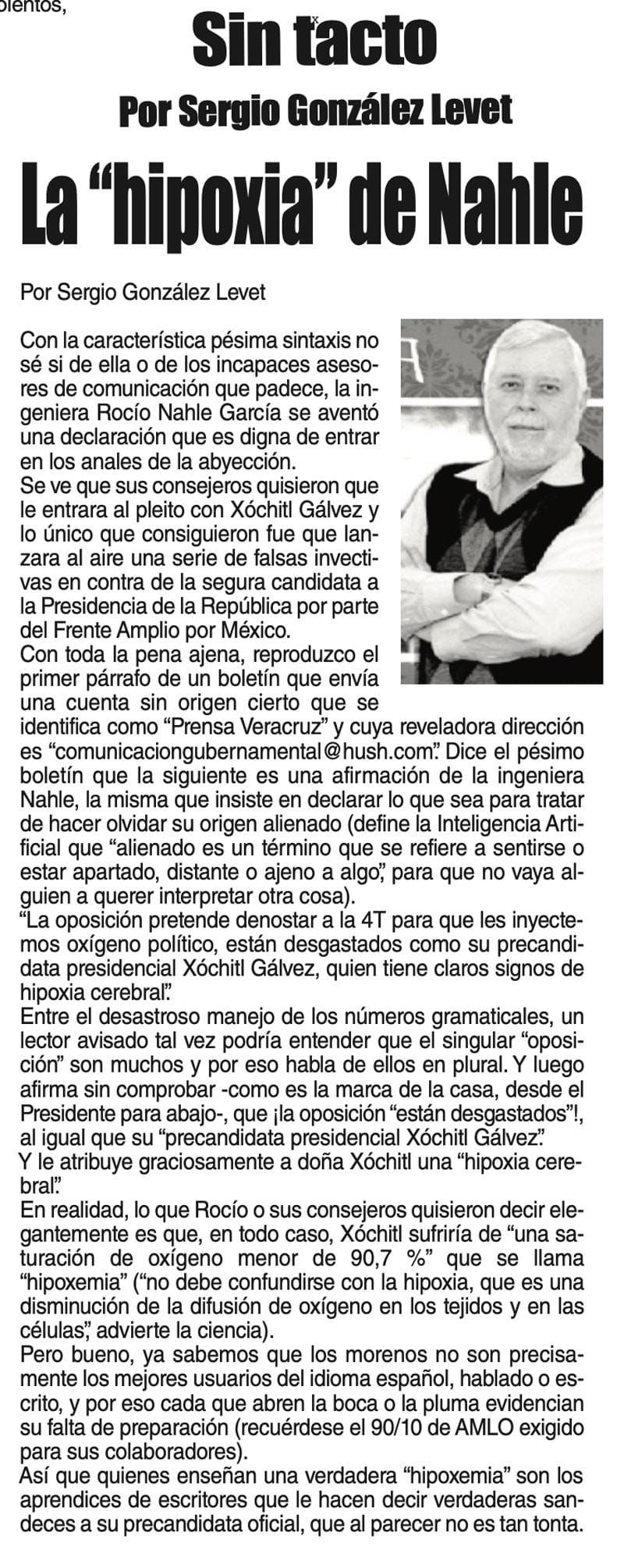 LAS COLUMNAS SIN TACTO - LA "HIPOXIA" DE NAHLE LA "HIPOXIA" DE NAHLE 20 diciembre 2023 Más Noticias LAS COSAS COMO SON | - MAS QUE UN DIARIO... TEXTO IRREVERENTE | LE VA A 'ECHAR GANITAS' - Al parecer, el asunto es 'chimoltrufiar' o sea lo mismo decir una cosa que otra. En marzo, el gobierno estatal informó que el programa de rehabilitación de carreteras y caminos conocido como "Bachetón"... ACERTIJOS | EL QUINTO PARTIDO - En la historia de los mundiales, México nunca ha jugado el quinto partido fuera de casa. Lo más que hemos alcanzado es el cuarto juego y de allí nos mandan a casa… A MIL POR HORA | - **Un matrimonio feliz **Apocalipsis jarocho **La isla de los pedófilos **“Amor con amor se paga”... A MIL POR HORA | - **Chicas más guapas **Días revolcados **Fascinantes artistas **Academia de Ególatras... CANCIONERO | EL PAN Y EL LLORO - Nada es accidental en la política. Este fin de semana, la señora presidente con A de patria tendrá una magna concentración de sus seguidores para celebrar el aniversario... TEXTO IRREVERENTE | ENNOCHEBUENADOS - La mercadotecnia adelanta todo y, ni modo, hay que lidiar con eso. Cuando todavía no acababa noviembre ya se vendían productos navideños y ahora mismo por doquiera se ven locales adornados con ese motivo... SIN TACTO | LAS VÍSPERAS - ¿Se acuerda la memorable lectora? ¿Recuerda el memorioso lector?: “Ya va llegando diciembre y sus posadas. Se va acercando ya también la Navidad. El año nuevo... LAS COSAS COMO SON - VAYA CINISMO... TEXTO IRREVERENTE | AÑO BUENO, AÑO MALO - El 2024 fue un año de suerte y abundancia. Este 2025 ha corrido en su contra con infortunio político y mediático. ¿‘Annus horribilis’? Tal vez no llega a tanto, pero sí desastroso y confirmatorio de sus...