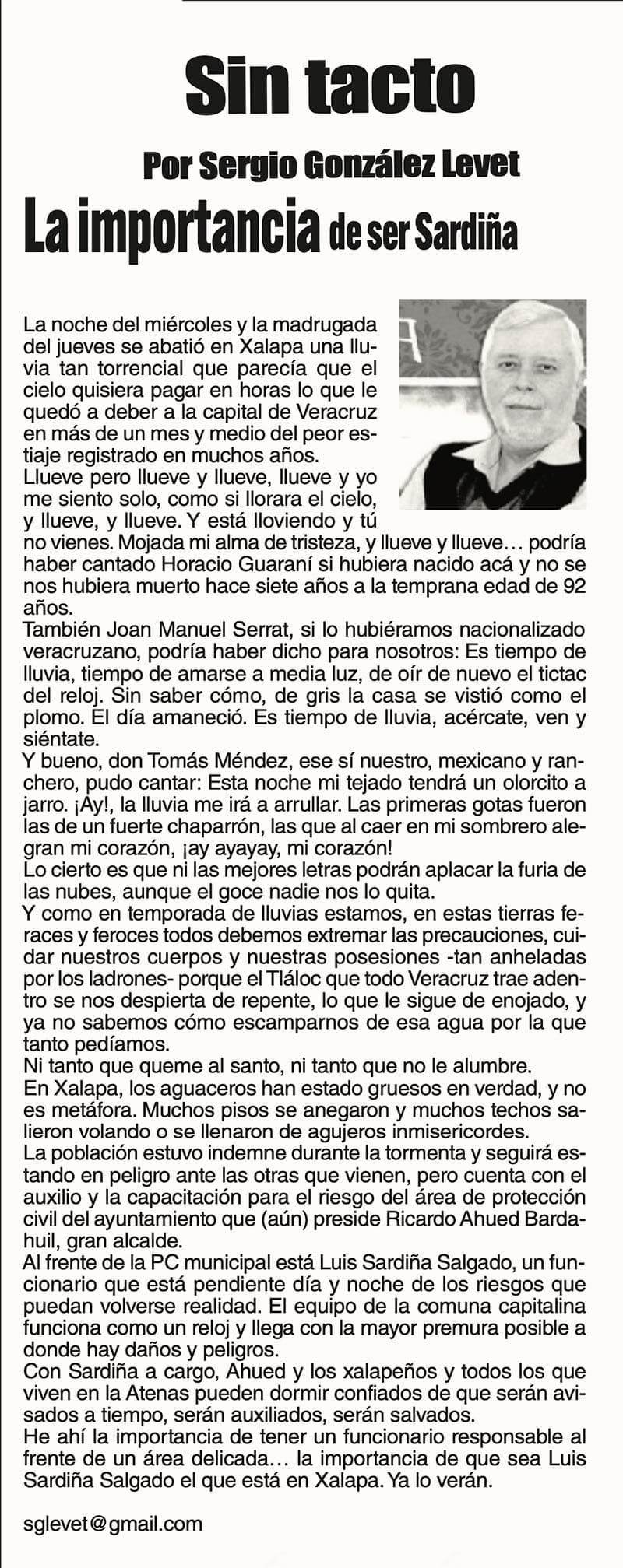 SIN TACTO | LA IMPORTANCIA DE SER SARDIÑA - La noche del miércoles y la madrugada del jueves se abatió en Xalapa una lluvia tan torrencial que parecía que el cielo quisiera pagar en horas lo que le quedó a deber a la capital de Veracruz...